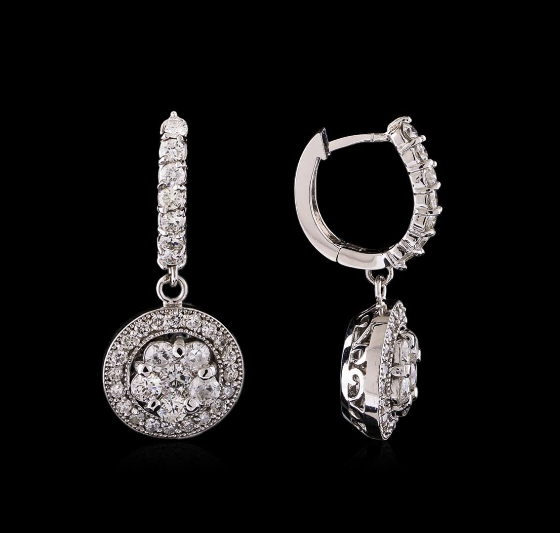 One pair electronically tested 14KT white gold Ladies combination cast & assembled earrings with hinged clip backs with a bright polish finish. Condition is new. Identified with markings of "14K". Containing: Fourteen prong set round brilliant cut diamonds, measuring 3.20 - 3.20 x 1.92mm (depth est.) approximate. Total Weight of 14 Stones = 1.68ct. Clarity: SI-1 to I-2. Color: J - K, Cut is Good. Fifty-Four prong set round brilliant cut diamonds, measuring 2.50 - 1.50 x 1.20mm (depth est.) approximate. Total Weight of 54 Stones = 1.58ct. Clarity: I-1 to I-2. Color: I - J, Cut is Good. All grading of diamonds and colored gemstones in this piece of jewelry are graded in the mounting, unless otherwise stated. Total Weight of Diamonds 3.26ct. Total Weight of Earrings 12.30 grams. GGL Appraised at $9,870.00.