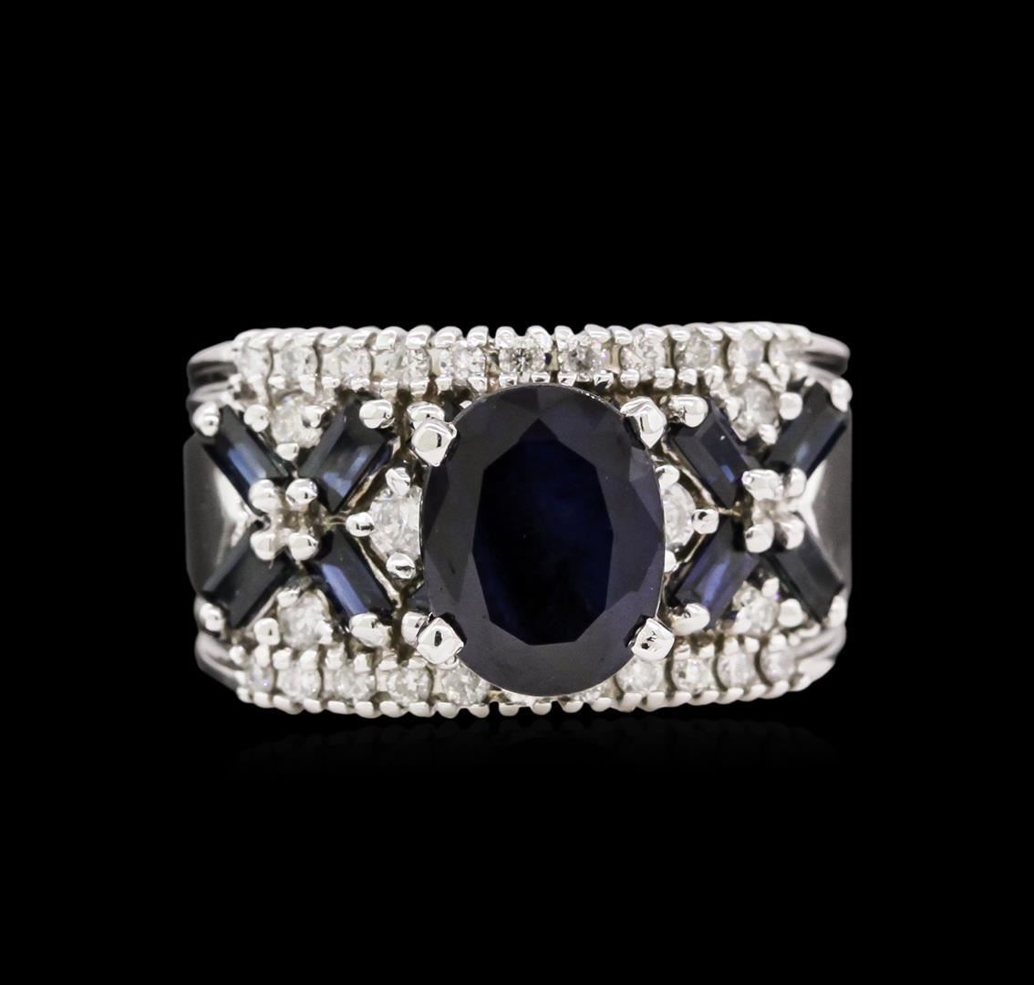 One electronically tested 14KT white gold Ladies combination cast & assembled ring with a bright polish finish. Condition is new. Identified with markings of "14K". Containing: One prong set oval modified brilliant cut natural blue sapphire, measuring 9.00 x 7.00 x 4.50mm, approximate weight of 2.30ct., clarity is heavily included, type II, dark, moderately strong, blue color, (GIA B 7/4), cut is very good. Twenty-Four prong set round brilliant cut diamonds, measuring 1.60 - 1.60 x 0.96mm (depth est.) approximate. Total Weight of 24 Stones = 0.36ct. Clarity: I-1 to I-2. Color: I - J, Cut is Good. Twelve prong set baguette standard step cut natural blue sapphires, measuring 3.00 x 2.00 x 1.30mm, approximate. Total Weight of 0.96ct., clarity is heavily included, type II, dark, moderately strong, blue color, (GIA B 7/4), cut is good. Colored gemstones are presumed to have been subjected to commonly used color/clarity enhancement processes. Six prong set round brilliant cut diamonds, measuring 2.00 - 2.00 x 1.20mm (depth est.) approximate. Total Weight of 6 Stones = 0.18ct. Clarity: I-1 to I-2. Color: H - I, Cut is Good. Total Weight of Colored Stones 3.26ct. Total Weight of Diamonds 0.53ct. Total Weight of Ring 7.70 grams. GGL Appraised at $4,275.00.