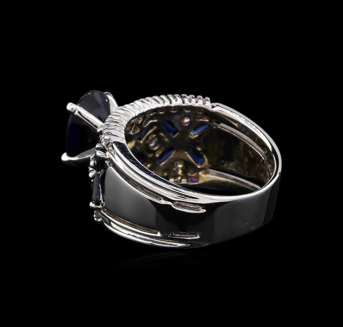 One electronically tested 14KT white gold Ladies combination cast & assembled ring with a bright polish finish. Condition is new. Identified with markings of "14K". Containing: One prong set oval modified brilliant cut natural blue sapphire, measuring 9.00 x 7.00 x 4.50mm, approximate weight of 2.30ct., clarity is heavily included, type II, dark, moderately strong, blue color, (GIA B 7/4), cut is very good. Twenty-Four prong set round brilliant cut diamonds, measuring 1.60 - 1.60 x 0.96mm (depth est.) approximate. Total Weight of 24 Stones = 0.36ct. Clarity: I-1 to I-2. Color: I - J, Cut is Good. Twelve prong set baguette standard step cut natural blue sapphires, measuring 3.00 x 2.00 x 1.30mm, approximate. Total Weight of 0.96ct., clarity is heavily included, type II, dark, moderately strong, blue color, (GIA B 7/4), cut is good. Colored gemstones are presumed to have been subjected to commonly used color/clarity enhancement processes. Six prong set round brilliant cut diamonds, measuring 2.00 - 2.00 x 1.20mm (depth est.) approximate. Total Weight of 6 Stones = 0.18ct. Clarity: I-1 to I-2. Color: H - I, Cut is Good. Total Weight of Colored Stones 3.26ct. Total Weight of Diamonds 0.53ct. Total Weight of Ring 7.70 grams. GGL Appraised at $4,275.00.