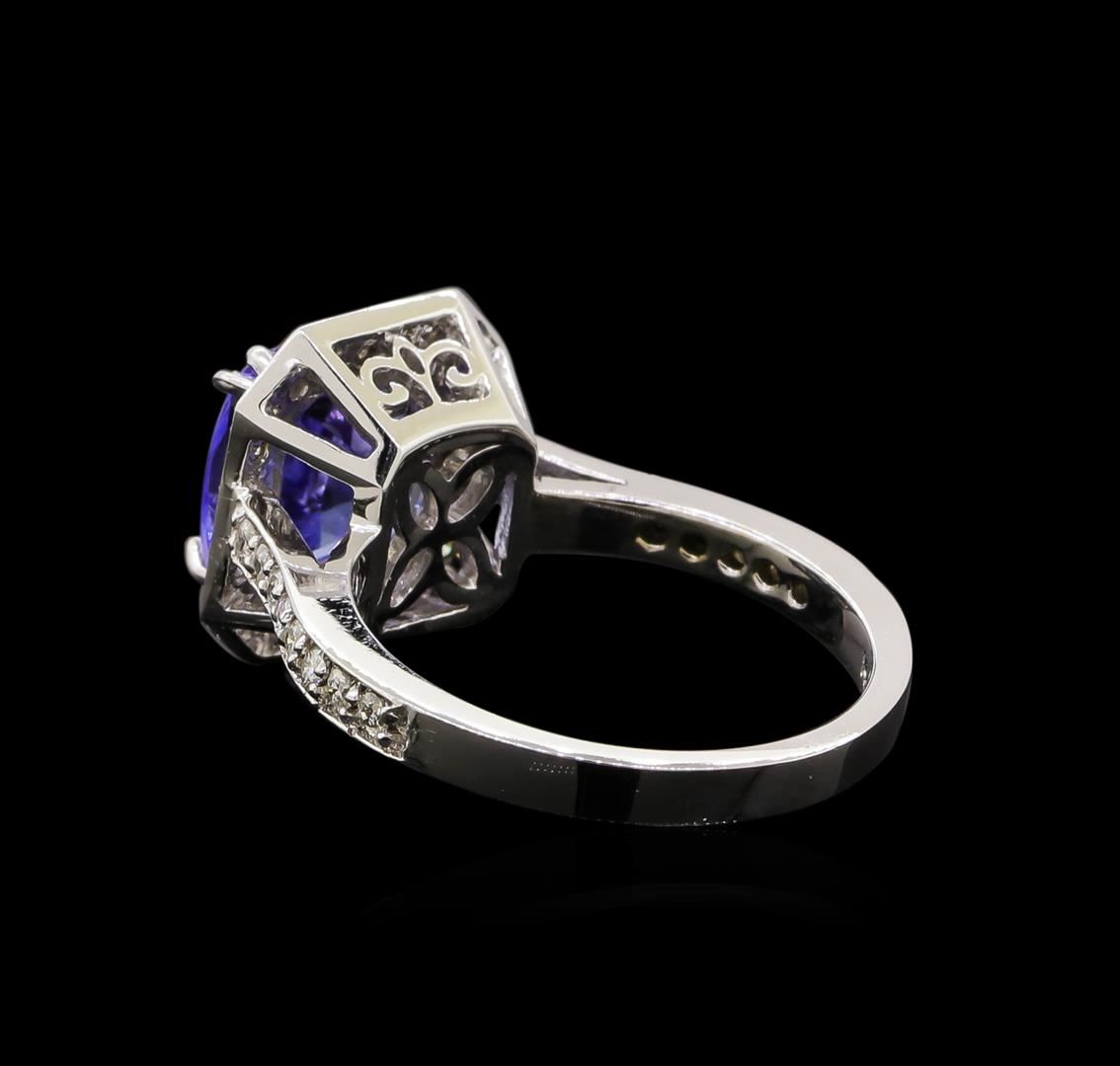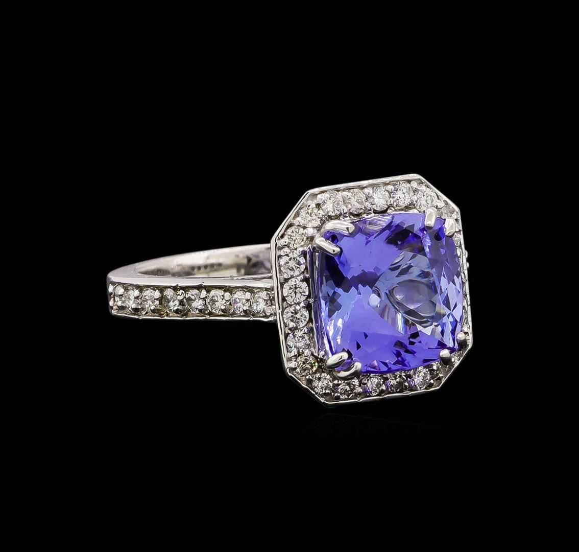 One electronically tested 14KT white gold ladies cast tanzanite and diamond ring with a bright polish finish. Identified with markings of "14K". Condition is new. Containing: One prong set square cushion modified brilliant cut natural tanzanite, measuring 8.90 x 8.90 x 5.23mm, approximate weight of 3.26ct., clarity is eye clean, type I, medium light, very slightly grayish, violet color, (GIA V 4/3), cut is good. One Hundred Six prong set round brilliant cut diamonds, measuring 1.80 - 1.00 x 0.84mm (depth est.) approximate total weight of 106 Stones = 1.06ct. Clarity: SI-1 to I-1. Color: I - J, Cut is Good. Colored gemstones are presumed to have been subjected to commonly used enhancement processes. All diamonds and colored gemstones are graded in the mounting, unless otherwise stated. Total Weight of Colored Stones 3.26ct. Total Weight of Diamonds 1.06ct. Total Weight of Ring 4.70 grams. GGL Appraised at $4,325.00.