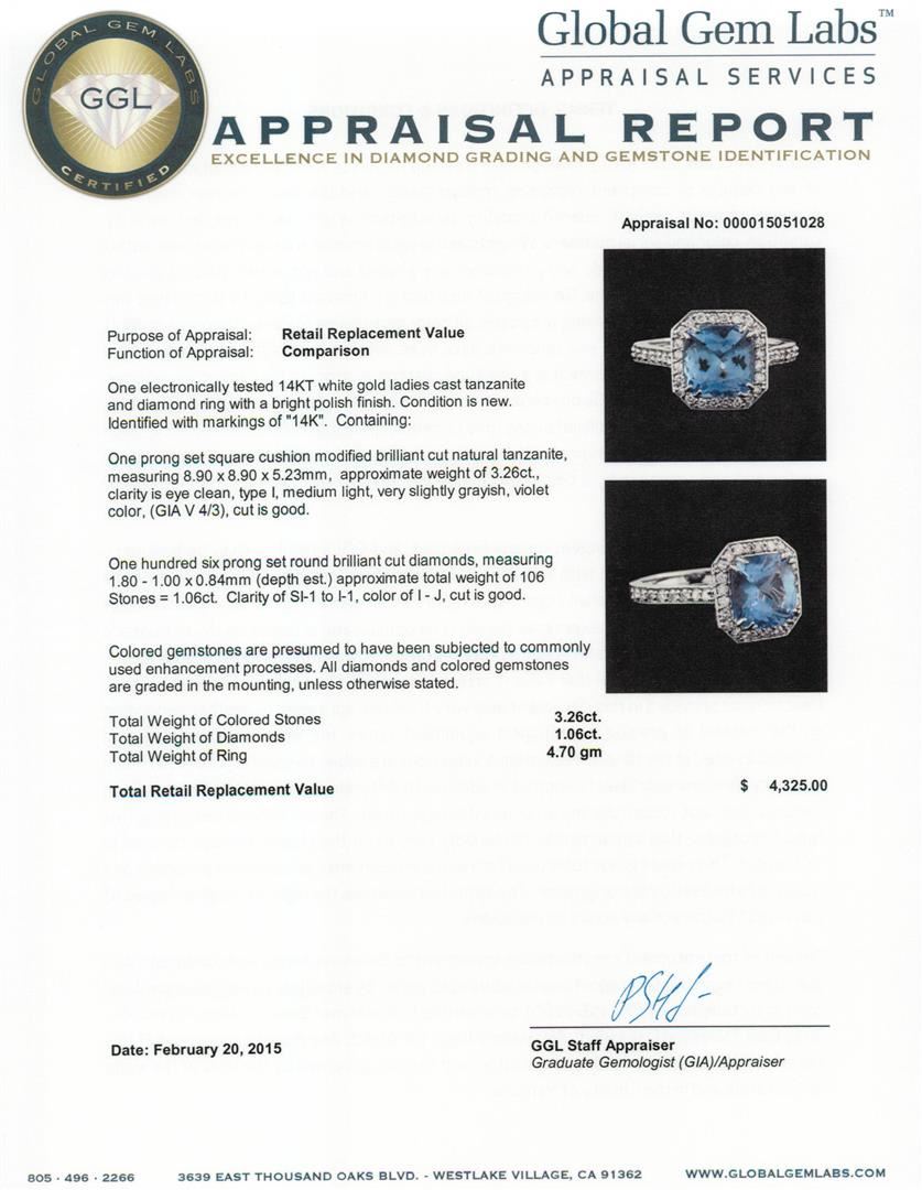 One electronically tested 14KT white gold ladies cast tanzanite and diamond ring with a bright polish finish. Identified with markings of "14K". Condition is new. Containing: One prong set square cushion modified brilliant cut natural tanzanite, measuring 8.90 x 8.90 x 5.23mm, approximate weight of 3.26ct., clarity is eye clean, type I, medium light, very slightly grayish, violet color, (GIA V 4/3), cut is good. One Hundred Six prong set round brilliant cut diamonds, measuring 1.80 - 1.00 x 0.84mm (depth est.) approximate total weight of 106 Stones = 1.06ct. Clarity: SI-1 to I-1. Color: I - J, Cut is Good. Colored gemstones are presumed to have been subjected to commonly used enhancement processes. All diamonds and colored gemstones are graded in the mounting, unless otherwise stated. Total Weight of Colored Stones 3.26ct. Total Weight of Diamonds 1.06ct. Total Weight of Ring 4.70 grams. GGL Appraised at $4,325.00.