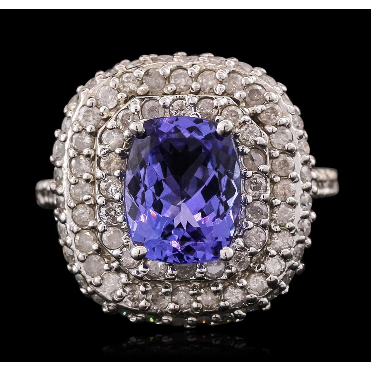 One electronically tested 14KT white gold ladies cast tanzanite & diamond ring with a bright finish. The featured tanzanite is set within tiered diamond bezels, supported by diamond set shoulders, completed by a two millimeter wide band. Condition is good. Containing: One prong set rectangular cushion mixed cut natural tanzanite, measuring 10.00 x 8.00 x 4.70mm, 10% bulge factor, approximate weight of 3.26ct., clarity is eye clean, type I, medium dark, slightly grayish, bluish violet color, (GIA bV 6/2), cut is good. Transmitting light with no distortion, transparent. Graded in the setting. Tanzanite is a very rare gemstone that is only found in the country of Tanzania. Originally discovered in 1967. Tiffany & Company, named the stone Tanzanite. It is found in the Usumburu Mountains that border the Umba Valley of northern Tanzania. Tanzanite occurs in gray, brown, violet, blue, reddish-purple, & green. The gem is interesting because of its exceptional pleochroism. Rotated in different directions a tanzanite will exhibit multiple changes of color. Tanzanite has a low tolerance to ultrasonic cleaning, and should not be cleaned using this method. One Hundred Four prong set round brilliant cut diamonds, measuring 1.70 - 1.50 x 0.96mm (depth est.) approximate total weight of 104 Stones = 1.50ct. Graded in the setting. Clarity: I-2 to I-3. Color: H - J. Total Weight of Colored Stones 3.26ct. Total Weight of Diamonds 1.50ct. Total Weight of Ring 9.50 grams. AIG Appraised at $9,750.00.