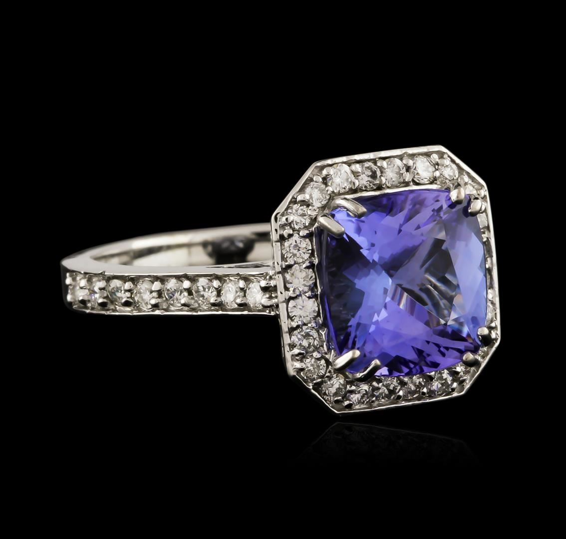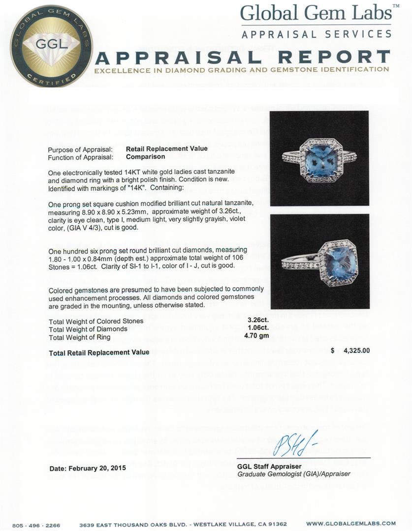 One electronically tested 14KT white gold ladies cast tanzanite and diamond ring with a bright polish finish. Identified with markings of "14K". Condition is new. Containing: One prong set square cushion modified brilliant cut natural tanzanite, measuring 8.90 x 8.90 x 5.23mm, approximate weight of 3.26ct., clarity is eye clean, type I, medium light, very slightly grayish, violet color, (GIA V 4/3), cut is good. One Hundred Six prong set round brilliant cut diamonds, measuring 1.80 - 1.00 x 0.84mm (depth est.) approximate total weight of 106 Stones = 1.06ct. Clarity: SI-1 to I-1. Color: I - J, Cut is Good. Colored gemstones are presumed to have been subjected to commonly used enhancement processes. All diamonds and colored gemstones are graded in the mounting, unless otherwise stated. Total Weight of Colored Stones 3.26ct. Total Weight of Diamonds 1.06ct. Total Weight of Ring 4.70 grams. GGL Appraised at $4,325.00.