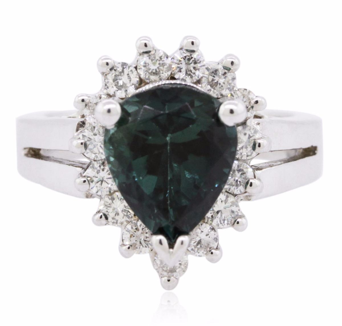 One electronically tested 14KT white gold ladies cast tourmaline and diamond ring with a bright polish finish. The featured tourmaline is set within a diamond bezel supported by split shoulders, completed by three millimeter wide band. Trademark is SA. Identified with markings of "14K". Condition is new, good workmanship. Containing: One prong set pear brilliant cut natural green tourmaline, measuring 10.00 x 8.05 x 6.25mm, 6%. bulge factor, approximate weight of 3.26ct., clarity is eye clean, type I, very dark, very slightly grayish, very strongly bluish green color, (GIA vstbG 8/3), cut is good. Transmitting light with no distortion, transparent. Refractive index testing results of 1.62 to 1.64. This is a conclusive result for tourmaline. Graded in the setting. Fifteen prong set round brilliant cut diamonds, measuring 2.20 - 2.10 x 1.29mm (depth est.) approximate total weight of 15 Stones = 0.64ct. Graded in the setting. Clarity: SI-2 to I-1. Color: G - I. Total Weight of Colored Stones 3.26ct. Total Weight of Diamonds 0.64ct. Total Weight of Ring 7.47 grams. AIG Appraised at $4,120.00.