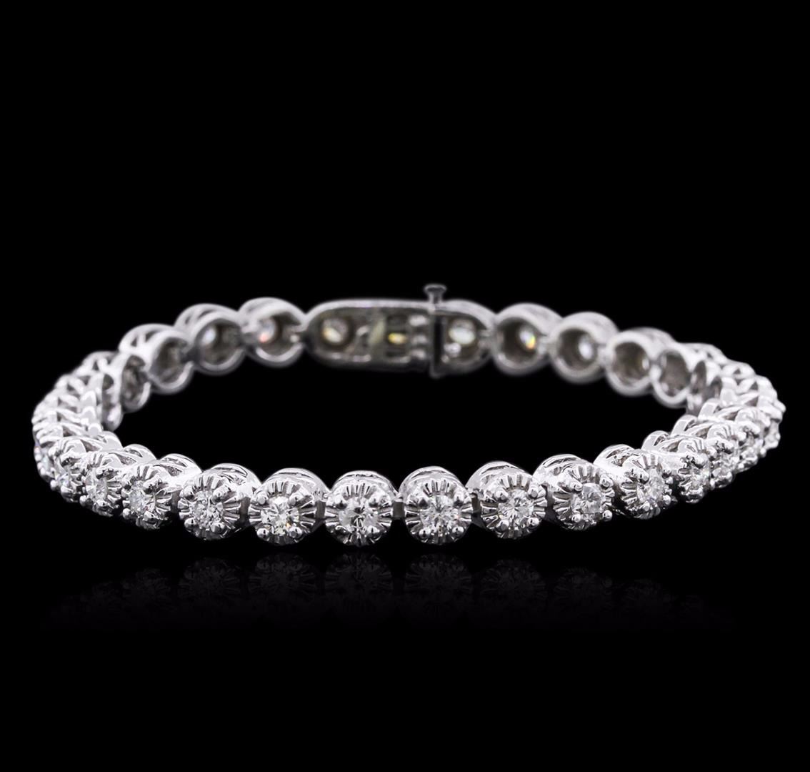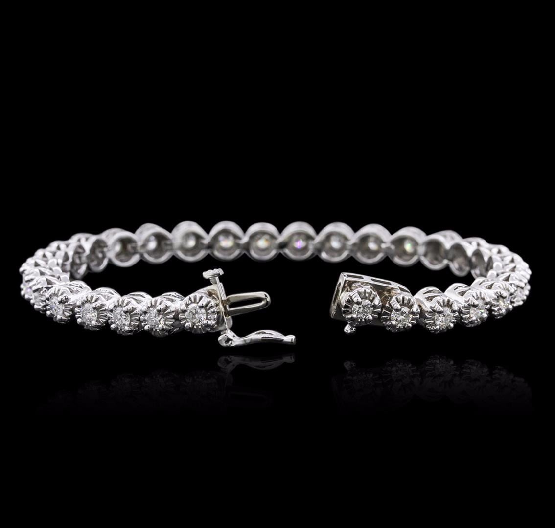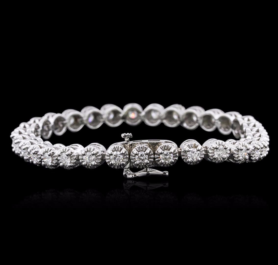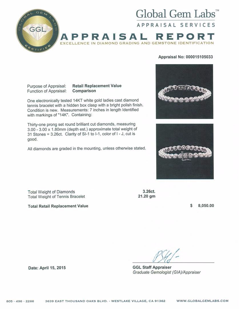 One electronically tested 14KT white gold ladies cast diamond tennis bracelet with a hidden box clasp with a bright polish finish. Measurements: 7 inches in length Identified with markings of "14K". Condition is new. Containing: Thirty-One prong set round brilliant cut diamonds, measuring 3.00. - 3.00. x 1.80mm (depth est.) approximate total weight of 31 Stones = 3.26ct. Clarity: SI-1 to I-1. Color: I - J, Cut is Good. All diamonds are graded in the mounting, unless otherwise stated. Total Weight of Diamonds 3.26ct. Total Weight of Tennis Bracelet 21.20 grams. GGL Appraised at $8,050.00.