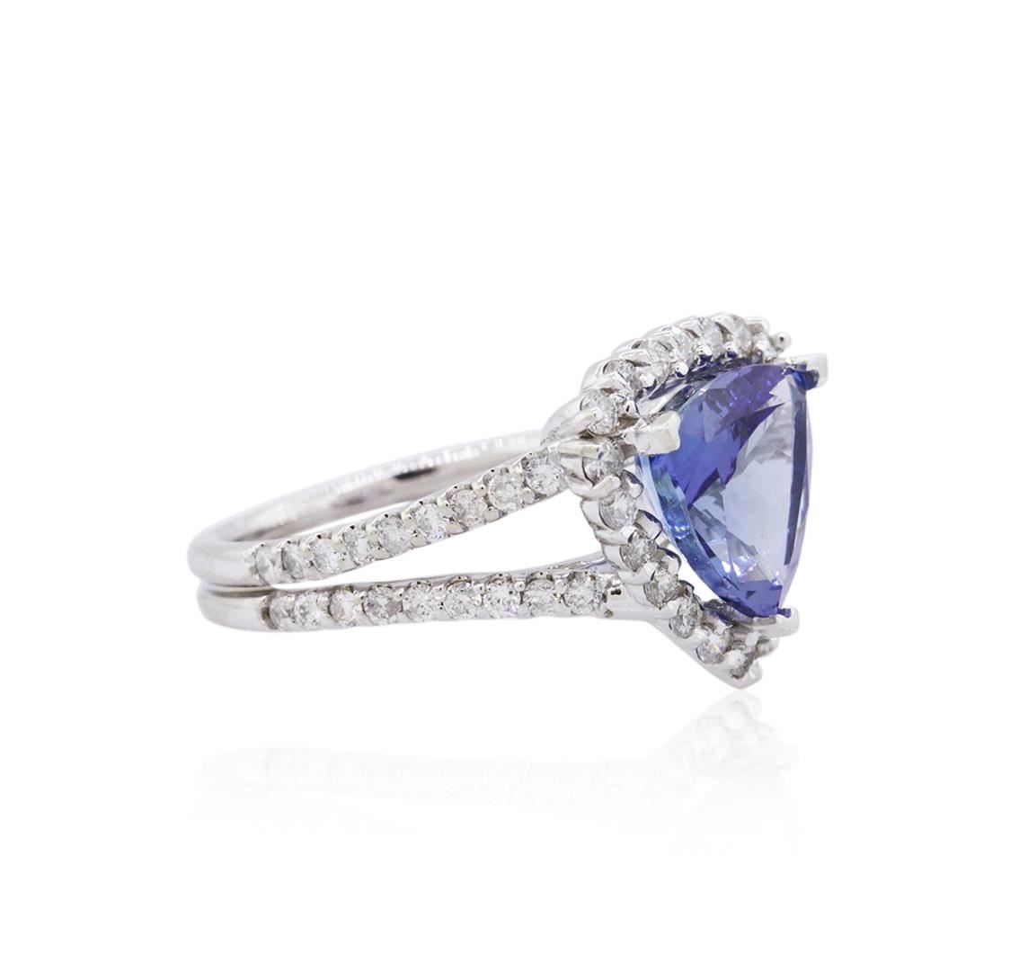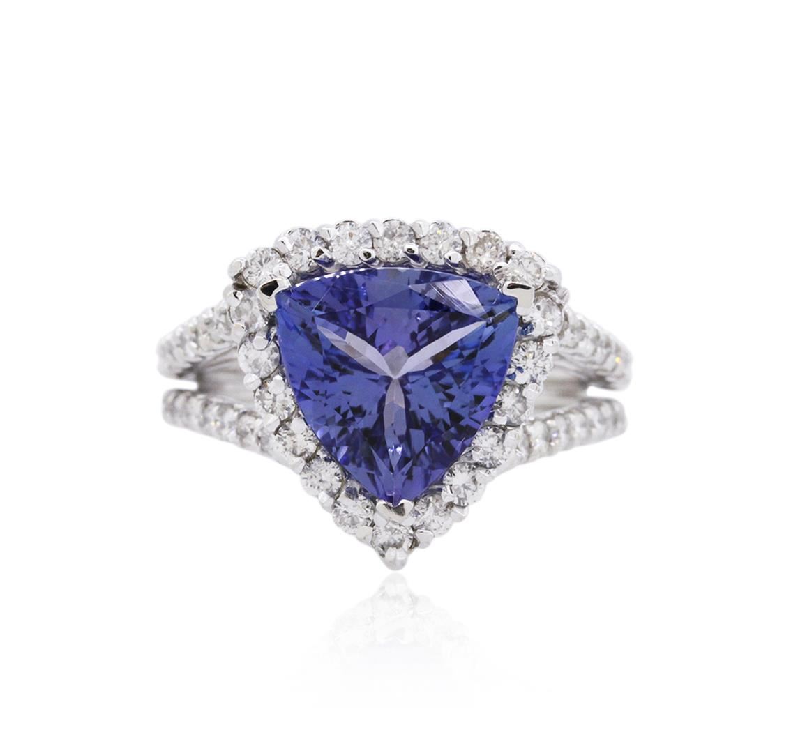 One electronically tested 14KT white gold ladies combination cast & assembled tanzanite and diamond ring with a split shoulder shank with a bright polish finish. Identified with markings of "14K". Condition is new. Containing: One prong set triangle modified brilliant cut natural tanzanite, measuring 9.73 x 9.57 x 5.82mm, approximate weight of 3.27ct., clarity is eye clean, type I, medium light, moderately strong, violet color, (GIA V 4/4), cut is good. Fifty-Six prong set round brilliant cut diamonds, measuring 1.50 - 1.50 x 0.90mm (depth est.) approximate total weight of 56 Stones = 0.69ct. Clarity: SI-2 to I-1. Color: I - J, Cut is Good. All diamonds and colored gemstones are graded in the mounting, unless otherwise stated. Colored gemstones are presumed to have been subjected to commonly used enhancement processes. Total Weight of Colored Stones 3.27ct. Total Weight of Diamonds 0.69ct. Total Weight of Ring 6.10 grams. GGL Appraised at $5,960.00.