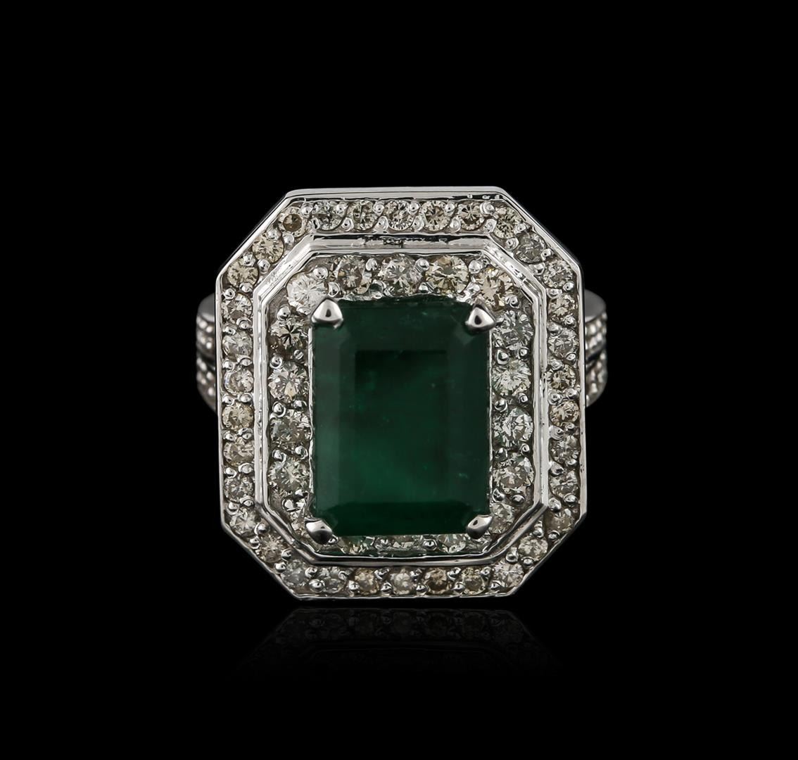 One electronically tested 14KT white gold ladies cast emerald and diamond ring with a bright polish finish. Identified with markings of "14K". Condition is new. Containing: One prong set oval emerald standard step cut natural emerald, measuring 11.82 x 6.10 x 6.20mm, approximate total weight of 3.28ct., clarity is heavily included, type III, medium dark, moderately strong, green color, (GIA G 6/4), cut is good. Seventy-Two prong set round brilliant cut diamonds, measuring 1.50 - 1.50 x 0.90mm (depth est.) approximate total weight of 72 Stones = 0.89ct. Clarity: I-1 to I-2. Color: I - J, Cut is Good. Diamonds and colored gemstones are graded in the mounting, unless otherwise stated. Colored gemstones are presumed to have been subjected to commonly used enhancement processes. Total Weight of Colored Stones 3.28ct. Total Weight of Diamonds 0.89ct. Total Weight of Ring 11.60 grams. GGL Appraised at $5,000.00.