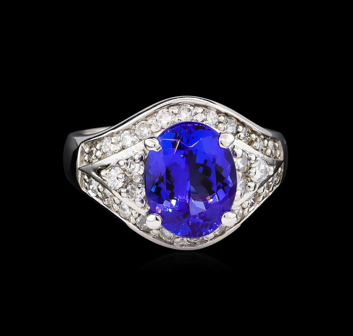 One electronically tested 14KT white gold Ladies combination cast & assembled ring with a bright polish finish. Condition is new. Identified with markings of "K14". Containing: One prong set oval modified brilliant cut natural tanzanite, measuring 10.50 x 8.20 x 5.60mm, approximate weight of 3.28ct., clarity is eye clean, type I, medium, moderately strong, bluish violet color, (GIA bV 5/4), cut is very good. Colored gemstones are presumed to have been subjected to commonly used color/clarity enhancement processes. Twenty-Eight prong set round brilliant cut diamonds, measuring 2.20 - 1.90 x 1.23mm (depth est.) approximate. Total Weight of 28 Stones = 0.88ct. Clarity: SI-2. Color: K - L, Cut is Good. Total Weight of Colored Stones 3.28ct. Total Weight of Diamonds 0.88ct. Total Weight of Ring 8.10 grams. GGL Appraised at $6,505.00.