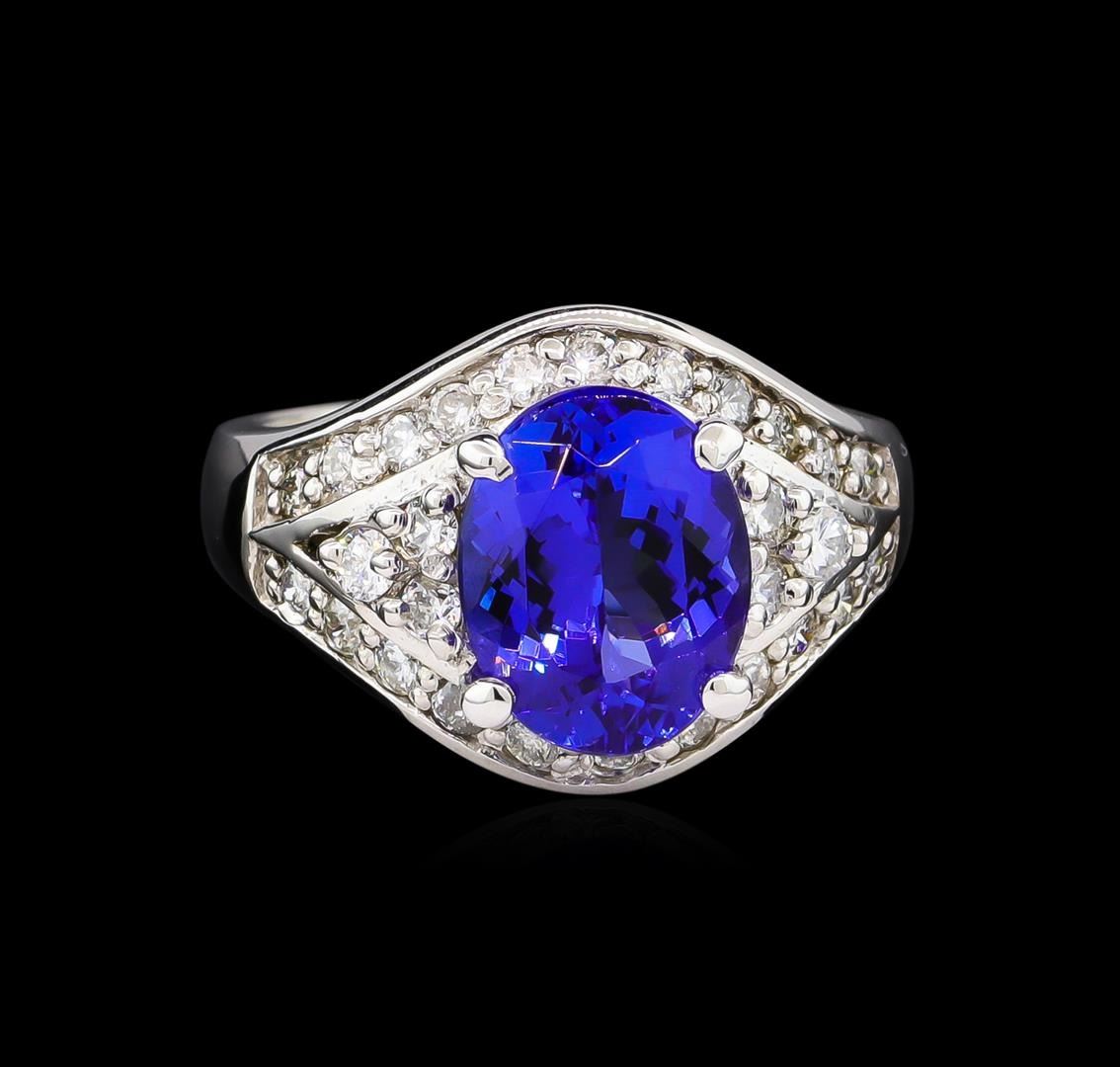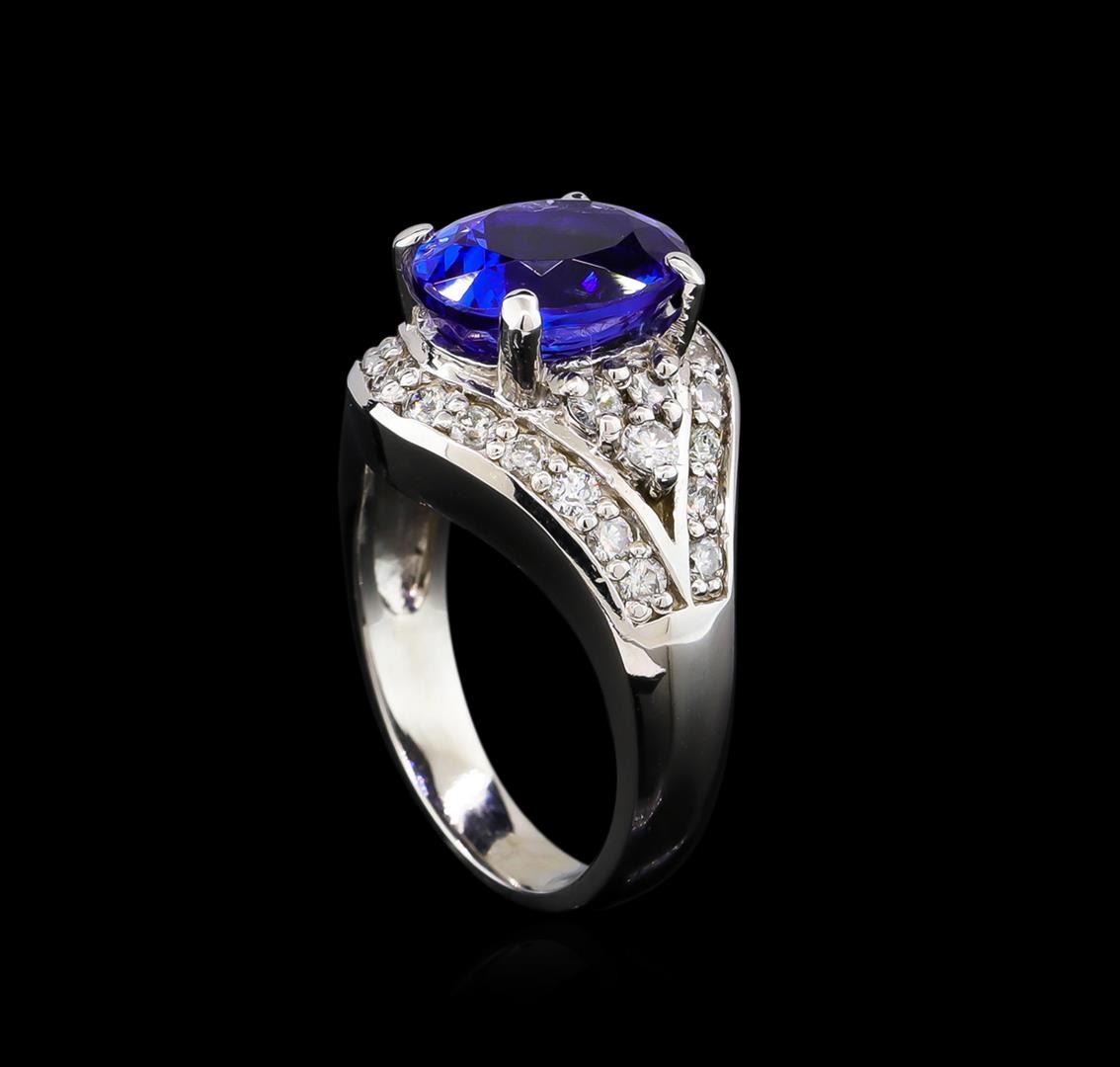 One electronically tested 14KT white gold Ladies combination cast & assembled ring with a bright polish finish. Condition is new. Identified with markings of "K14". Containing: One prong set oval modified brilliant cut natural tanzanite, measuring 10.50 x 8.20 x 5.60mm, approximate weight of 3.28ct., clarity is eye clean, type I, medium, moderately strong, bluish violet color, (GIA bV 5/4), cut is very good. Colored gemstones are presumed to have been subjected to commonly used color/clarity enhancement processes. Twenty-Eight prong set round brilliant cut diamonds, measuring 2.20 - 1.90 x 1.23mm (depth est.) approximate. Total Weight of 28 Stones = 0.88ct. Clarity: SI-2. Color: K - L, Cut is Good. Total Weight of Colored Stones 3.28ct. Total Weight of Diamonds 0.88ct. Total Weight of Ring 8.10 grams. GGL Appraised.