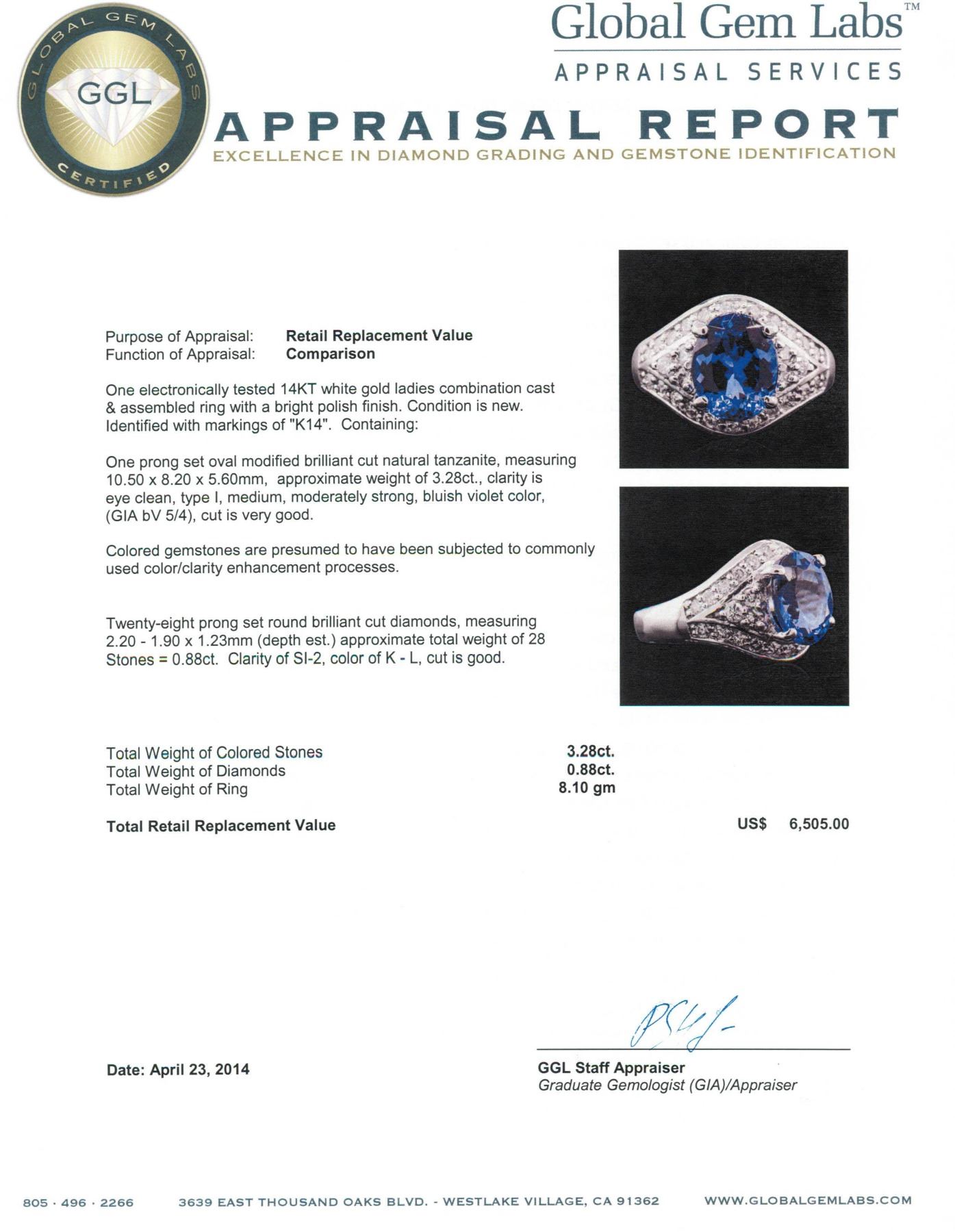 One electronically tested 14KT white gold Ladies combination cast & assembled ring with a bright polish finish. Condition is new. Identified with markings of "K14". Containing: One prong set oval modified brilliant cut natural tanzanite, measuring 10.50 x 8.20 x 5.60mm, approximate weight of 3.28ct., clarity is eye clean, type I, medium, moderately strong, bluish violet color, (GIA bV 5/4), cut is very good. Colored gemstones are presumed to have been subjected to commonly used color/clarity enhancement processes. Twenty-Eight prong set round brilliant cut diamonds, measuring 2.20 - 1.90 x 1.23mm (depth est.) approximate. Total Weight of 28 Stones = 0.88ct. Clarity: SI-2. Color: K - L, Cut is Good. Total Weight of Colored Stones 3.28ct. Total Weight of Diamonds 0.88ct. Total Weight of Ring 8.10 grams. GGL Appraised.