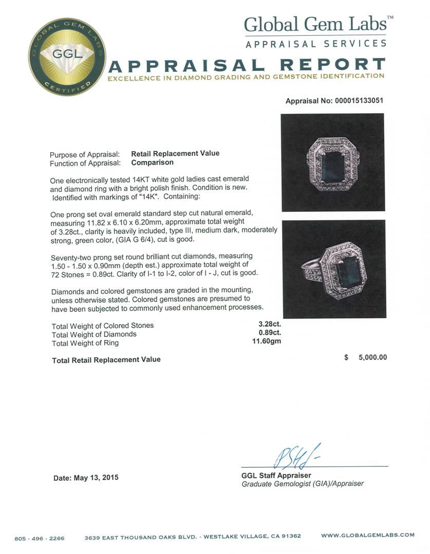 One electronically tested 14KT white gold ladies cast emerald and diamond ring with a bright polish finish. Identified with markings of "14K". Condition is new. Containing: One prong set oval emerald standard step cut natural emerald, measuring 11.82 x 6.10 x 6.20mm, approximate total weight of 3.28ct., clarity is heavily included, type III, medium dark, moderately strong, green color, (GIA G 6/4), cut is good. Seventy-Two prong set round brilliant cut diamonds, measuring 1.50 - 1.50 x 0.90mm (depth est.) approximate total weight of 72 Stones = 0.89ct. Clarity: I-1 to I-2. Color: I - J, Cut is Good. Diamonds and colored gemstones are graded in the mounting, unless otherwise stated. Colored gemstones are presumed to have been subjected to commonly used enhancement processes. Total Weight of Colored Stones 3.28ct. Total Weight of Diamonds 0.89ct. Total Weight of Ring 11.60 grams. GGL Appraised at $5,000.00.