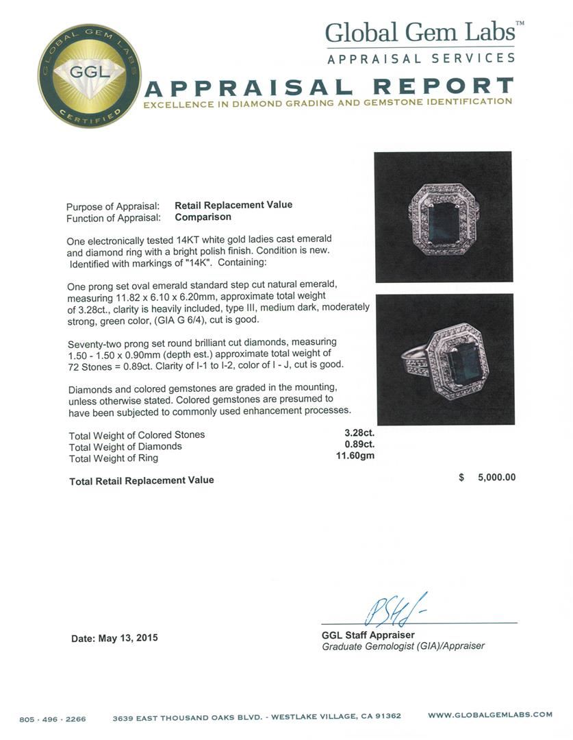 One electronically tested 14KT white gold ladies cast emerald and diamond ring with a bright polish finish. Identified with markings of "14K". Condition is new. Containing: One prong set oval emerald standard step cut natural emerald, measuring 11.82 x 6.10 x 6.20mm, approximate total weight of 3.28ct., clarity is heavily included, type III, medium dark, moderately strong, green color, (GIA G 6/4), cut is good. Seventy-Two prong set round brilliant cut diamonds, measuring 1.50 - 1.50 x 0.90mm (depth est.) approximate total weight of 72 Stones = 0.89ct. Clarity: I-1 to I-2. Color: I - J, Cut is Good. Diamonds and colored gemstones are graded in the mounting, unless otherwise stated. Colored gemstones are presumed to have been subjected to commonly used enhancement processes. Total Weight of Colored Stones 3.28ct. Total Weight of Diamonds 0.89ct. Total Weight of Ring 11.60 grams. GGL Appraised at $5,000.00.