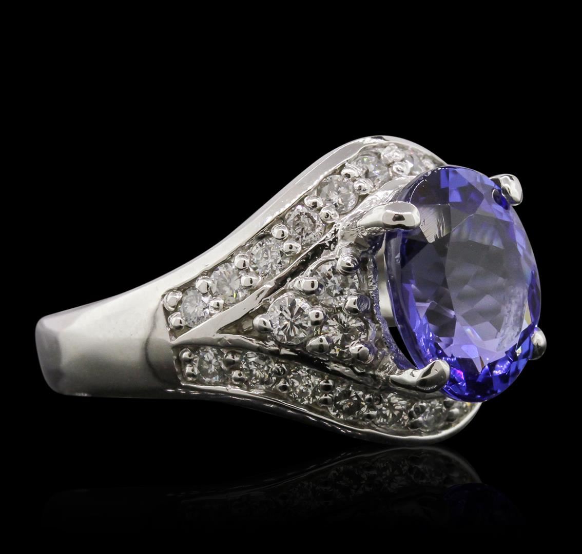 One electronically tested 14KT white gold Ladies combination cast & assembled ring with a bright polish finish. Condition is new. Identified with markings of "K14". Containing: One prong set oval modified brilliant cut natural tanzanite, measuring 10.50 x 8.20 x 5.60mm, approximate weight of 3.28ct., clarity is eye clean, type I, medium, moderately strong, bluish violet color, (GIA bV 5/4), cut is very good. Colored gemstones are presumed to have been subjected to commonly used color/clarity enhancement processes. Twenty-Eight prong set round brilliant cut diamonds, measuring 2.20 - 1.90 x 1.23mm (depth est.) approximate. Total Weight of 28 Stones = 0.88ct. Clarity: SI-2. Color: K - L, Cut is Good. Total Weight of Colored Stones 3.28ct. Total Weight of Diamonds 0.88ct. Total Weight of Ring 8.10 grams. GGL Appraised at $6,505.00.