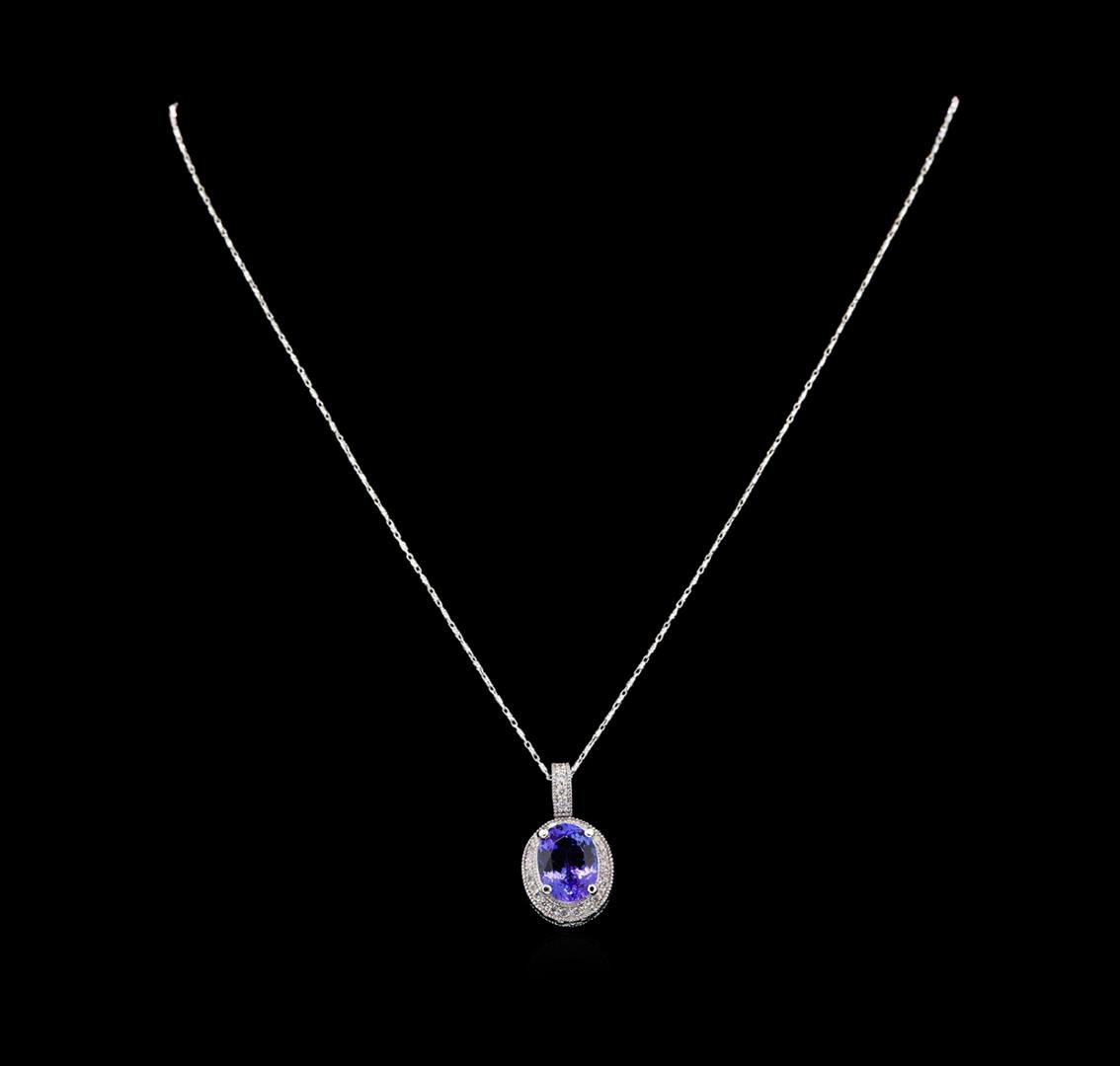 One electronically tested 14KT white gold ladies cast & assembled tanzanite and diamond pendant with chain. The pendant features a tanzanite set within a diamond bezel, completed by a diamond set bail. The pendant is supported by an eighteen inch length 14KT white gold designer style chain, terminating in a lobster claw clasp. Bright polish finish with milgrain detailing. Identified with markings of "14K". Condition is new, good workmanship. Containing: One prong set oval mixed cut natural tanzanite, measuring 11.10 x 8.26 x 4.95mm, 6% bulge factor, approximate weight of 3.29ct., clarity is eye clean, type I, medium dark, very slightly grayish, bluish violet color, (GIA bV 6/3), cut is good. Transmitting light with no distortion, transparent. Graded in the setting. Tanzanite is a very rare gemstone that is only found in the country of Tanzania. Originally discovered in 1967. Tiffany & Company, named the stone Tanzanite. It is found in the Usumburu Mountains that border the Umba Valley of northern Tanzania. Tanzanite occurs in gray, brown, violet, blue, reddish-purple, & green. The gem is interesting because of its exceptional pleochroism. Rotated in different directions a tanzanite will exhibit multiple changes of color. Tanzanite has a low tolerance to ultrasonic cleaning, and should not be cleaned using this method. Thirty-Four prong set round brilliant cut diamonds, measuring 1.70 - 1.20 x 0.87mm (depth est.) approximate total weight of 34 Stones = 0.35ct. Graded in the setting. Clarity: I-1 to I-3. Color: H - J. Total Weight of Colored Stones 3.29ct. Total Weight of Diamonds 0.35ct. Total Weight of Pendant With Chain 6.61 grams. AIG Appraised at $9,630.00.