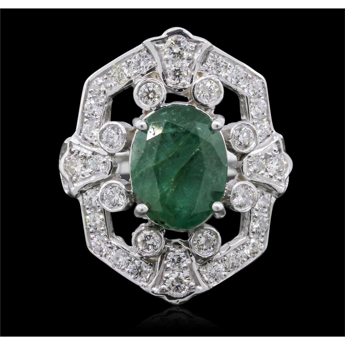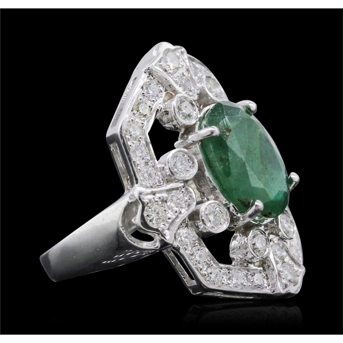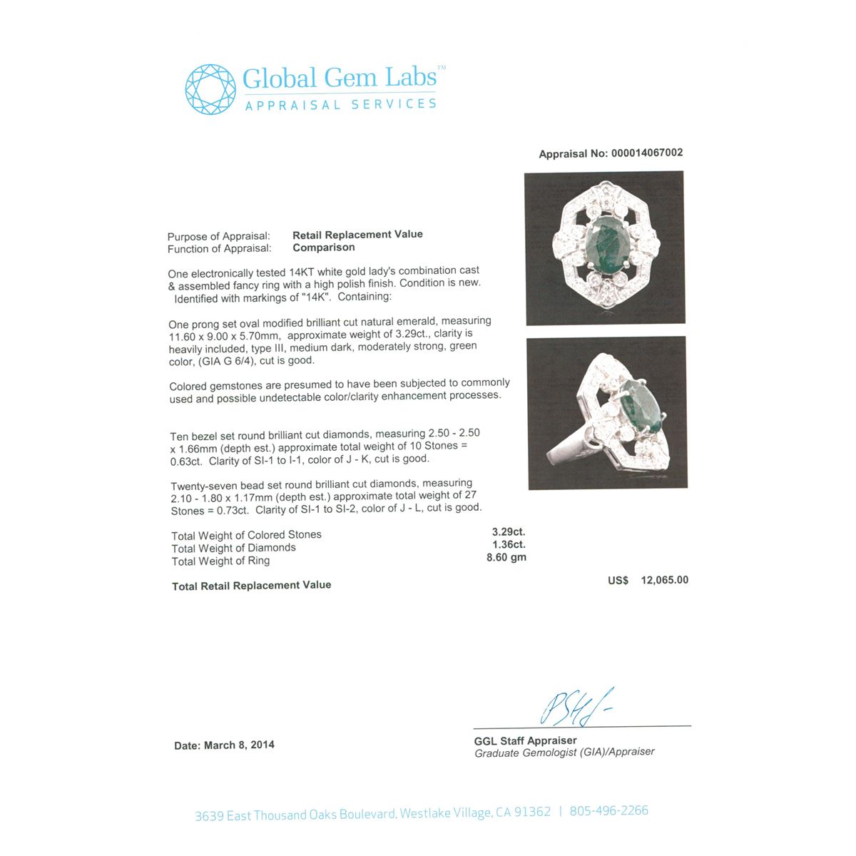 One electronically tested 14KT white gold Ladies combination cast & assembled fancy ring with a high polish finish. Condition is new. Identified with markings of "14K". Containing: One prong set oval modified brilliant cut natural emerald, measuring 11.60 x 9.00 x 5.70mm, approximate weight of 3.29ct., clarity is heavily included, type III, medium dark, moderately strong, green color, (GIA G 6/4), cut is good. Colored gemstones are presumed to have been subjected to commonly used and possible undetectable color/clarity enhancement processes. Ten bezel set round brilliant cut diamonds, measuring 2.50 - 2.50 x 1.66mm (depth est.) approximate total weight of 10 Stones = 0.63ct. Clarity of SI-1 to I-1, Color of J - K, Cut is Good. Twenty-Seven bead set round brilliant cut diamonds, measuring 2.10 - 1.80 x 1.17mm (depth est.) approximate total weight of 27 Stones = 0.73ct. Clarity of SI-1 to SI-2, Color of J - L, Cut is Good. Total Weight of Colored Stones 3.29ct. Total Weight of Diamonds 1.36ct. Total Weight of Ring 8.60 grams. GGL Appraised at $12,065.00.