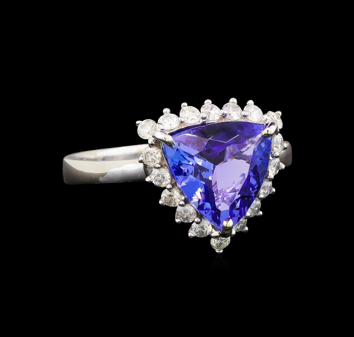 One electronically tested 14KT white gold ladies cast tanzanite and diamond ring with a flat shank with a bright polish finish. Trademark is Orianne. Identified with markings of "14K". Condition is new. Containing: One prong set triangle modified brilliant cut natural tanzanite, measuring 9.30 x 9.30 x 6.32mm, approximate weight of 3.30ct., clarity is eye clean, type I, medium light, very slightly grayish, violet color, (GIA V 4/3), cut is good. Eighteen prong set round brilliant cut diamonds, measuring 1.50 - 1.50 x 0.90mm (depth est.) approximate total weight of 18 Stones = 0.22ct. Clarity: SI-2 to I-2. Color: I - J, Cut is Good. All diamonds and colored gemstones are graded in the mounting, unless otherwise stated. Colored gemstones are presumed to have been subjected to commonly used enhancement processes.. Total Weight of Colored Stones 3.30ct. Total Weight of Diamonds 0.22ct. Total Weight of Ring 3.40 grams. GGL Appraised at $3,280.00.