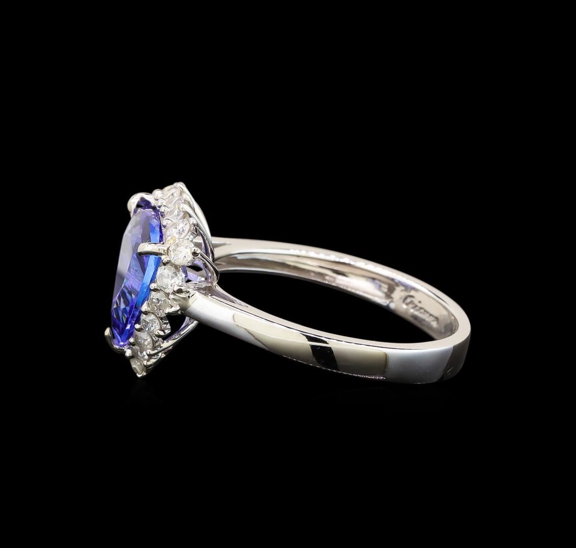One electronically tested 14KT white gold ladies cast tanzanite and diamond ring with a flat shank with a bright polish finish. Trademark is Orianne. Identified with markings of "14K". Condition is new. Containing: One prong set triangle modified brilliant cut natural tanzanite, measuring 9.30 x 9.30 x 6.32mm, approximate weight of 3.30ct., clarity is eye clean, type I, medium light, very slightly grayish, violet color, (GIA V 4/3), cut is good. Eighteen prong set round brilliant cut diamonds, measuring 1.50 - 1.50 x 0.90mm (depth est.) approximate total weight of 18 Stones = 0.22ct. Clarity: SI-2 to I-2. Color: I - J, Cut is Good. All diamonds and colored gemstones are graded in the mounting, unless otherwise stated. Colored gemstones are presumed to have been subjected to commonly used enhancement processes.. Total Weight of Colored Stones 3.30ct. Total Weight of Diamonds 0.22ct. Total Weight of Ring 3.40 grams. GGL Appraised at $3,280.00.