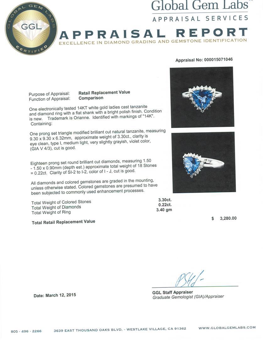 One electronically tested 14KT white gold ladies cast tanzanite and diamond ring with a flat shank with a bright polish finish. Trademark is Orianne. Identified with markings of "14K". Condition is new. Containing: One prong set triangle modified brilliant cut natural tanzanite, measuring 9.30 x 9.30 x 6.32mm, approximate weight of 3.30ct., clarity is eye clean, type I, medium light, very slightly grayish, violet color, (GIA V 4/3), cut is good. Eighteen prong set round brilliant cut diamonds, measuring 1.50 - 1.50 x 0.90mm (depth est.) approximate total weight of 18 Stones = 0.22ct. Clarity: SI-2 to I-2. Color: I - J, Cut is Good. All diamonds and colored gemstones are graded in the mounting, unless otherwise stated. Colored gemstones are presumed to have been subjected to commonly used enhancement processes.. Total Weight of Colored Stones 3.30ct. Total Weight of Diamonds 0.22ct. Total Weight of Ring 3.40 grams. GGL Appraised at $3,280.00.