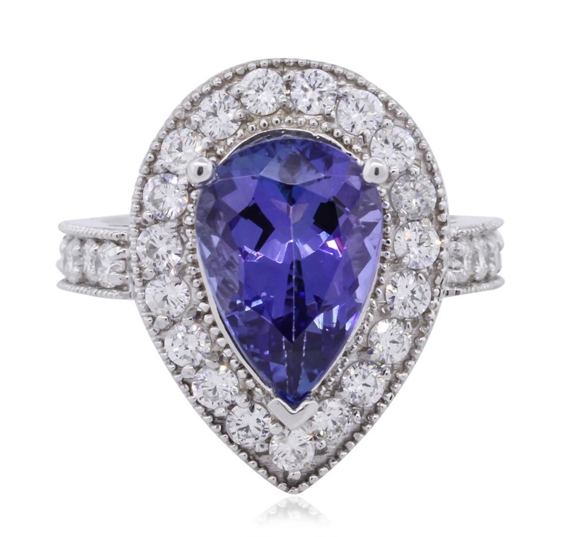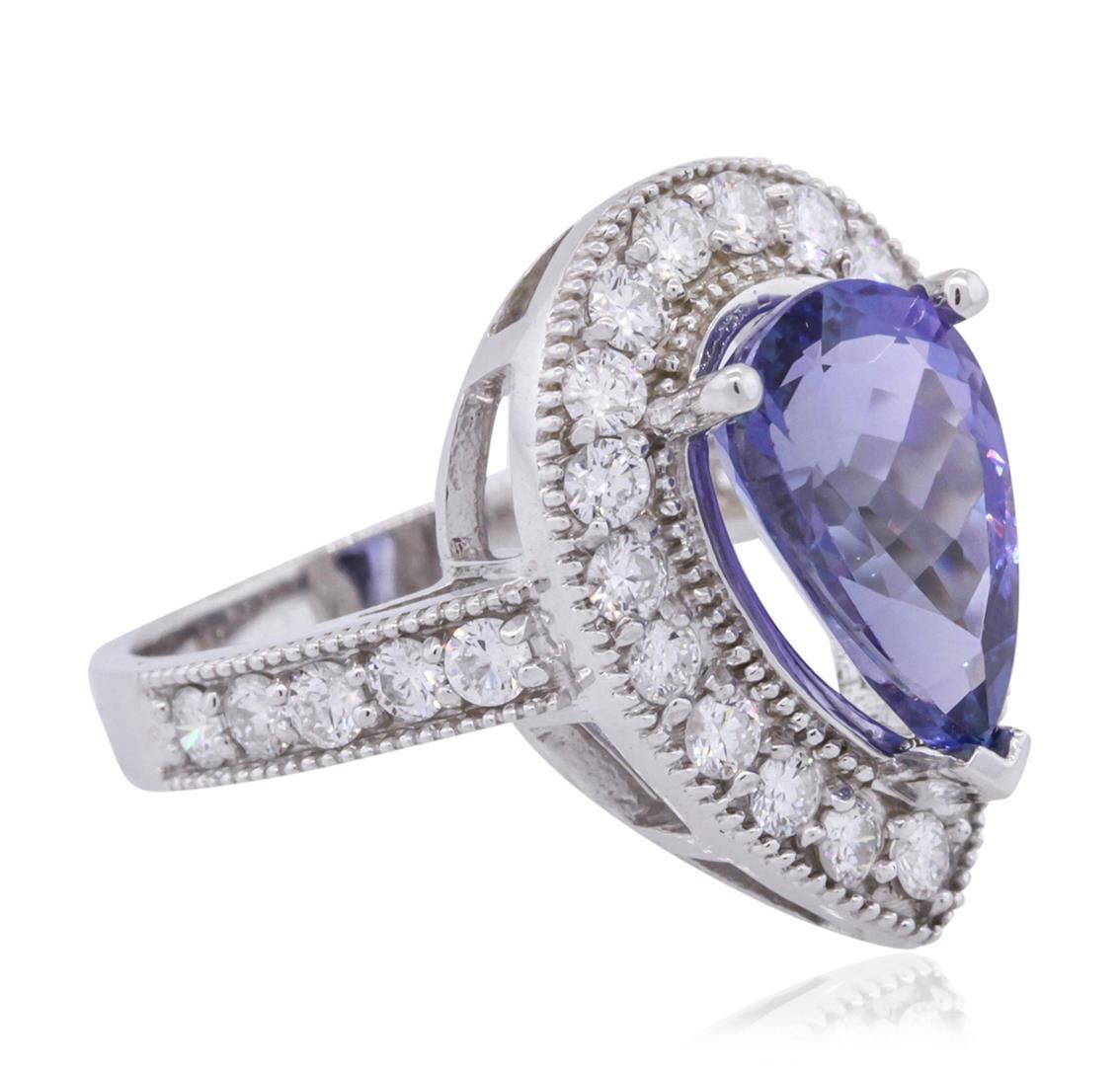 One electronically tested 14KT white gold ladies combination cast & assembled tanzanite and diamond ring with a flat shank with a bright polish finish. Identified with markings of "K14". Condition is new. Containing: One prong set pear modified brilliant cut natural tanzanite, measuring 12.00 x 8.71 x 4.71mm, approximate weight of 3.30ct., clarity is eye clean, type I, medium, moderately strong, violet color, (GIA V 5/4), cut is good. Twenty-Nine prong set round brilliant cut diamonds, measuring 2.00 - 2.00 x 1.20mm (depth est.) approximate total weight of 29 Stones = 0.85ct. Clarity: SI-2. Color: I - J, Cut is Good. Colored gemstones are presumed to have been subjected to commonly used enhancement processes. All diamonds and colored gemstones are graded in the mounting, unless otherwise stated. Total Weight of Colored Stones 3.30ct. Total Weight of Diamonds 0.85ct. Total Weight of Ring 7.20 grams. GGL Appraised at $6,740.00.