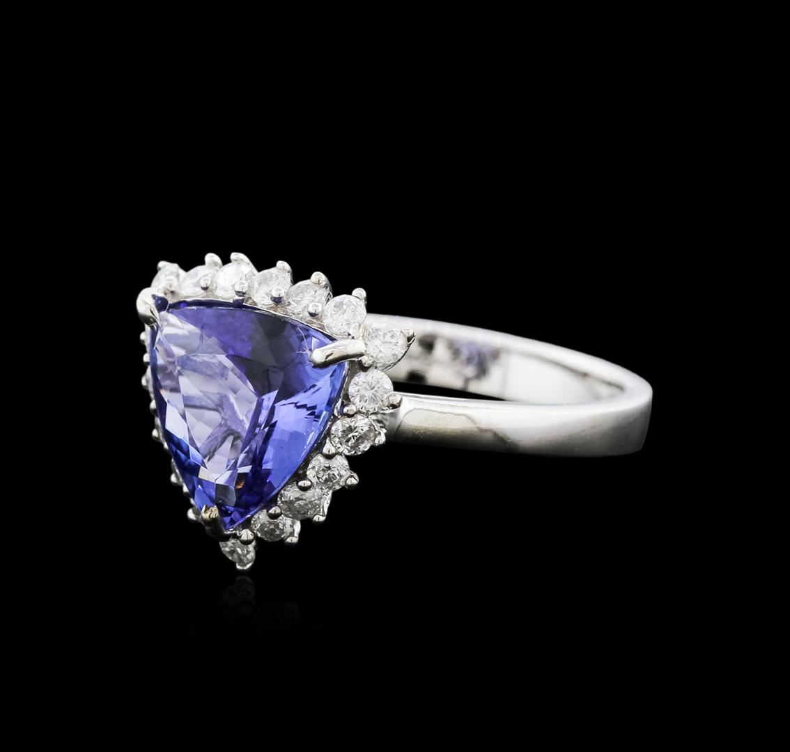 One electronically tested 14KT white gold ladies cast tanzanite and diamond ring with a flat shank with a bright polish finish. Trademark is Orianne. Identified with markings of "14K". Condition is new. Containing: One prong set triangle modified brilliant cut natural tanzanite, measuring 9.30 x 9.30 x 6.32mm, approximate weight of 3.30ct., clarity is eye clean, type I, medium light, very slightly grayish, violet color, (GIA V 4/3), cut is good. Eighteen prong set round brilliant cut diamonds, measuring 1.50 - 1.50 x 0.90mm (depth est.) approximate total weight of 18 Stones = 0.22ct. Clarity: SI-2 to I-2. Color: I - J, Cut is Good. All diamonds and colored gemstones are graded in the mounting, unless otherwise stated. Colored gemstones are presumed to have been subjected to commonly used enhancement processes.. Total Weight of Colored Stones 3.30ct. Total Weight of Diamonds 0.22ct. Total Weight of Ring 3.40 grams. GGL Appraised at $3,280.00.