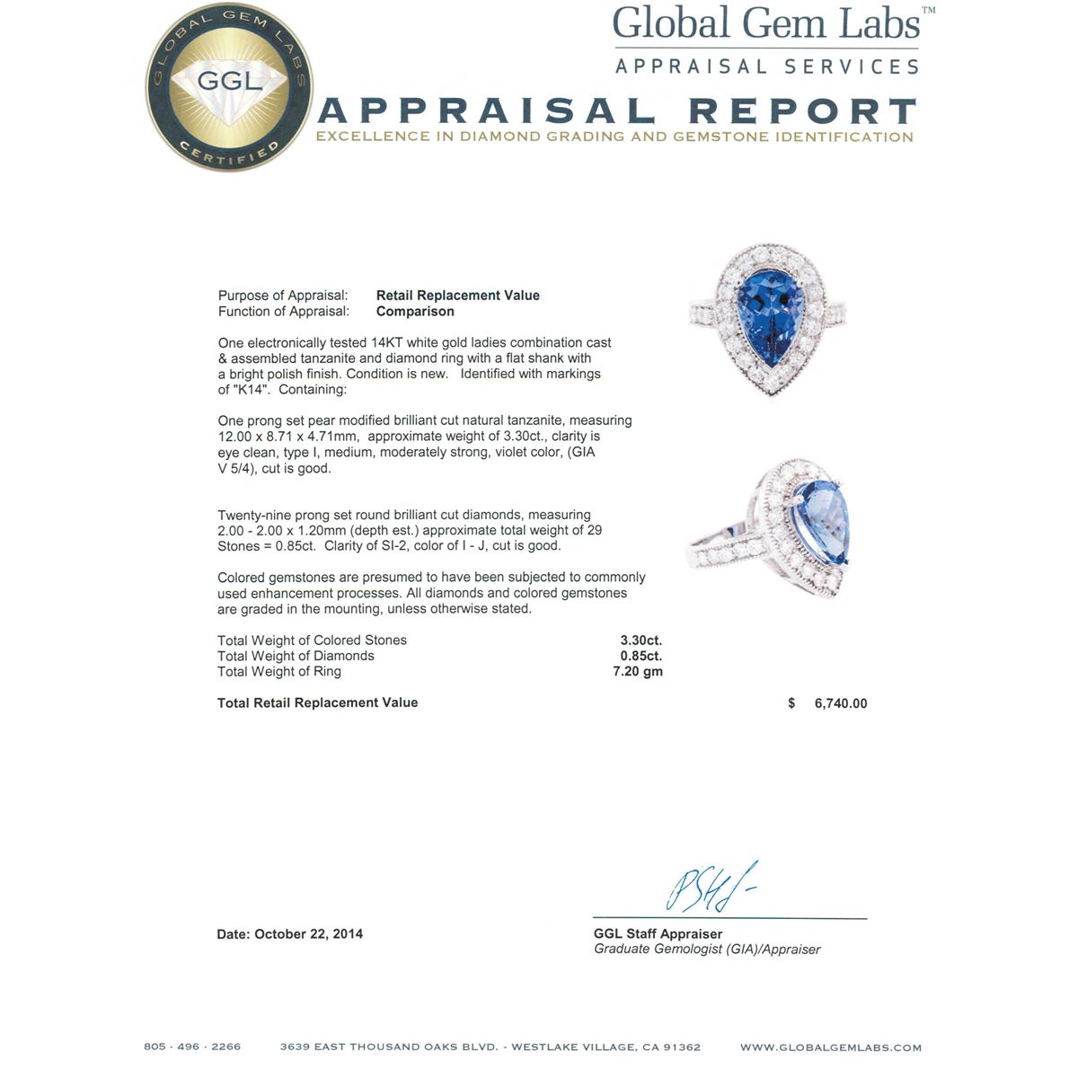 One electronically tested 14KT white gold ladies combination cast & assembled tanzanite and diamond ring with a flat shank with a bright polish finish. Identified with markings of "K14". Condition is new. Containing: One prong set pear modified brilliant cut natural tanzanite, measuring 12.00 x 8.71 x 4.71mm, approximate weight of 3.30ct., clarity is eye clean, type I, medium, moderately strong, violet color, (GIA V 5/4), cut is good. Twenty-Nine prong set round brilliant cut diamonds, measuring 2.00 - 2.00 x 1.20mm (depth est.) approximate total weight of 29 Stones = 0.85ct. Clarity: SI-2. Color: I - J, Cut is Good. Colored gemstones are presumed to have been subjected to commonly used enhancement processes. All diamonds and colored gemstones are graded in the mounting, unless otherwise stated. Total Weight of Colored Stones 3.30ct. Total Weight of Diamonds 0.85ct. Total Weight of Ring 7.20 grams. GGL Appraised at $6,740.00.