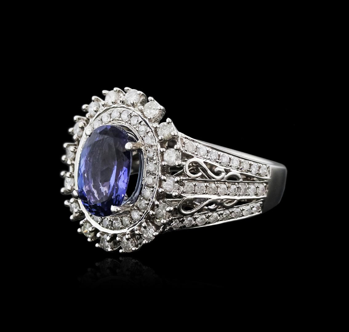 One electronically tested 14KT white gold ladies cast tanzanite and diamond ring with a bright polish finish. Identified with markings of "14K". Condition is new. Containing: One prong set square cushion modified brilliant cut natural tanzanite, measuring 10.30 x 7.00. x 5.62mm, approximate weight of 3.31ct., clarity is eye clean, type I, medium light, very slightly grayish, violet color, (GIA V 4/3), cut is good. Eighty-Seven prong set round brilliant cut diamonds, measuring 1.50 - 1.20 x 0.81mm (depth est.) approximate total weight of 87 Stones = 0.78ct. Clarity: SI-2 to I-2. Color: I - J. All diamonds and colored gemstones are graded in the mounting, unless otherwise stated. Colored gemstones are presumed to have been subjected to commonly used enhancement processes.. Total Weight of Colored Stones 3.31ct. Total Weight of Diamonds 0.78ct. Total Weight of Ring 8.10 grams. GGL Appraised at $6,330.00.
