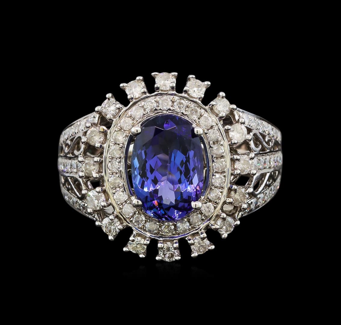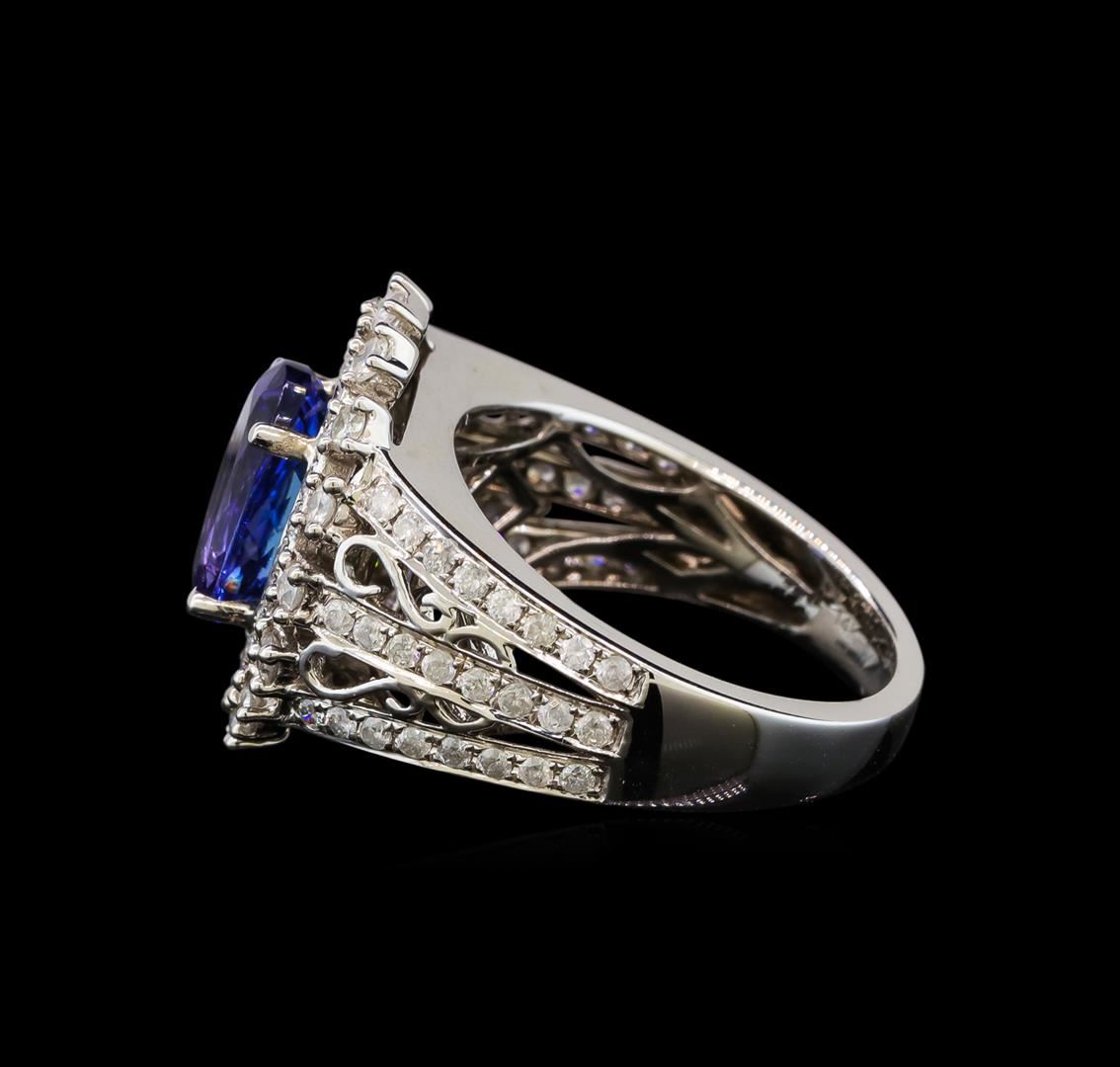 One electronically tested 14KT white gold ladies cast tanzanite and diamond ring with a bright polish finish. Identified with markings of "14K". Condition is new. Containing: One prong set square cushion modified brilliant cut natural tanzanite, measuring 10.30 x 7.00. x 5.62mm, approximate weight of 3.31ct., clarity is eye clean, type I, medium light, very slightly grayish, violet color, (GIA V 4/3), cut is good. Eighty-Seven prong set round brilliant cut diamonds, measuring 1.50 - 1.20 x 0.81mm (depth est.) approximate total weight of 87 Stones = 0.78ct. Clarity: SI-2 to I-2. Color: I - J. All diamonds and colored gemstones are graded in the mounting, unless otherwise stated. Colored gemstones are presumed to have been subjected to commonly used enhancement processes.. Total Weight of Colored Stones 3.31ct. Total Weight of Diamonds 0.78ct. Total Weight of Ring 8.10 grams. GGL Appraised at $6,330.00.