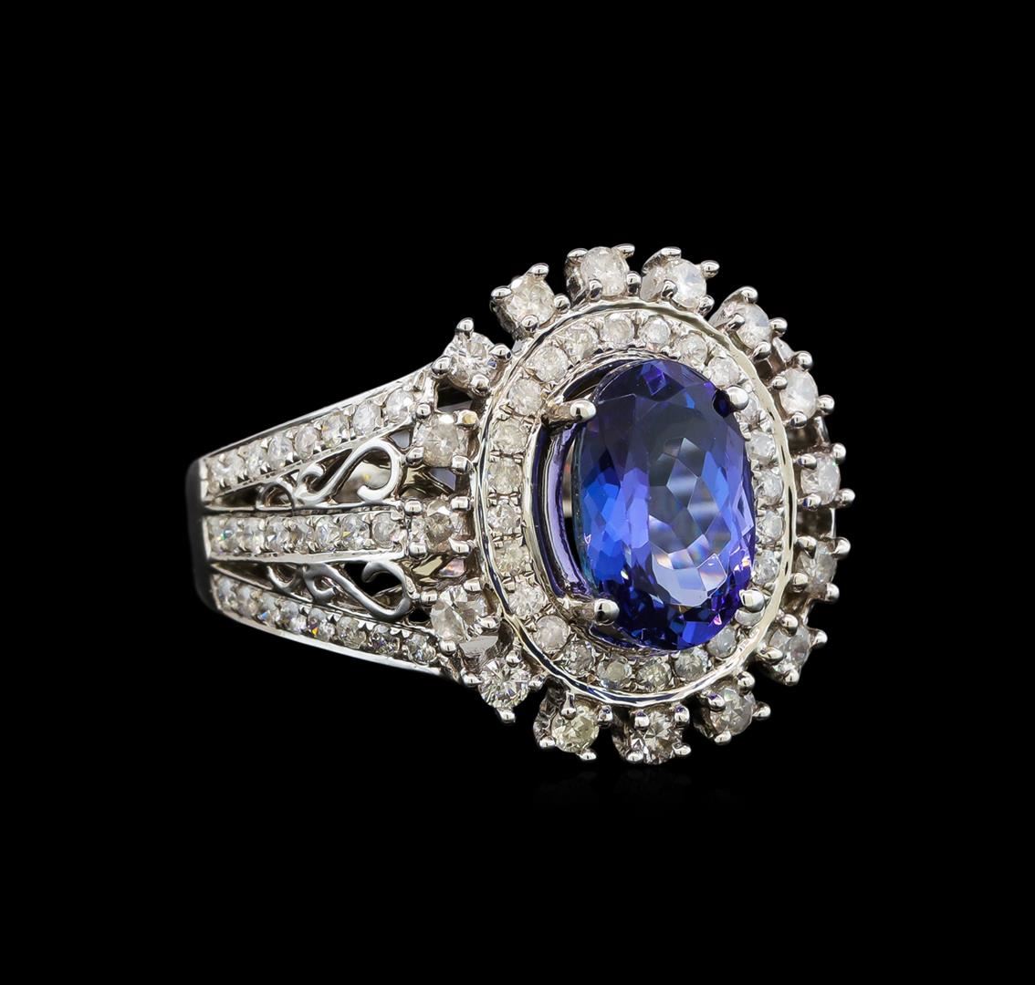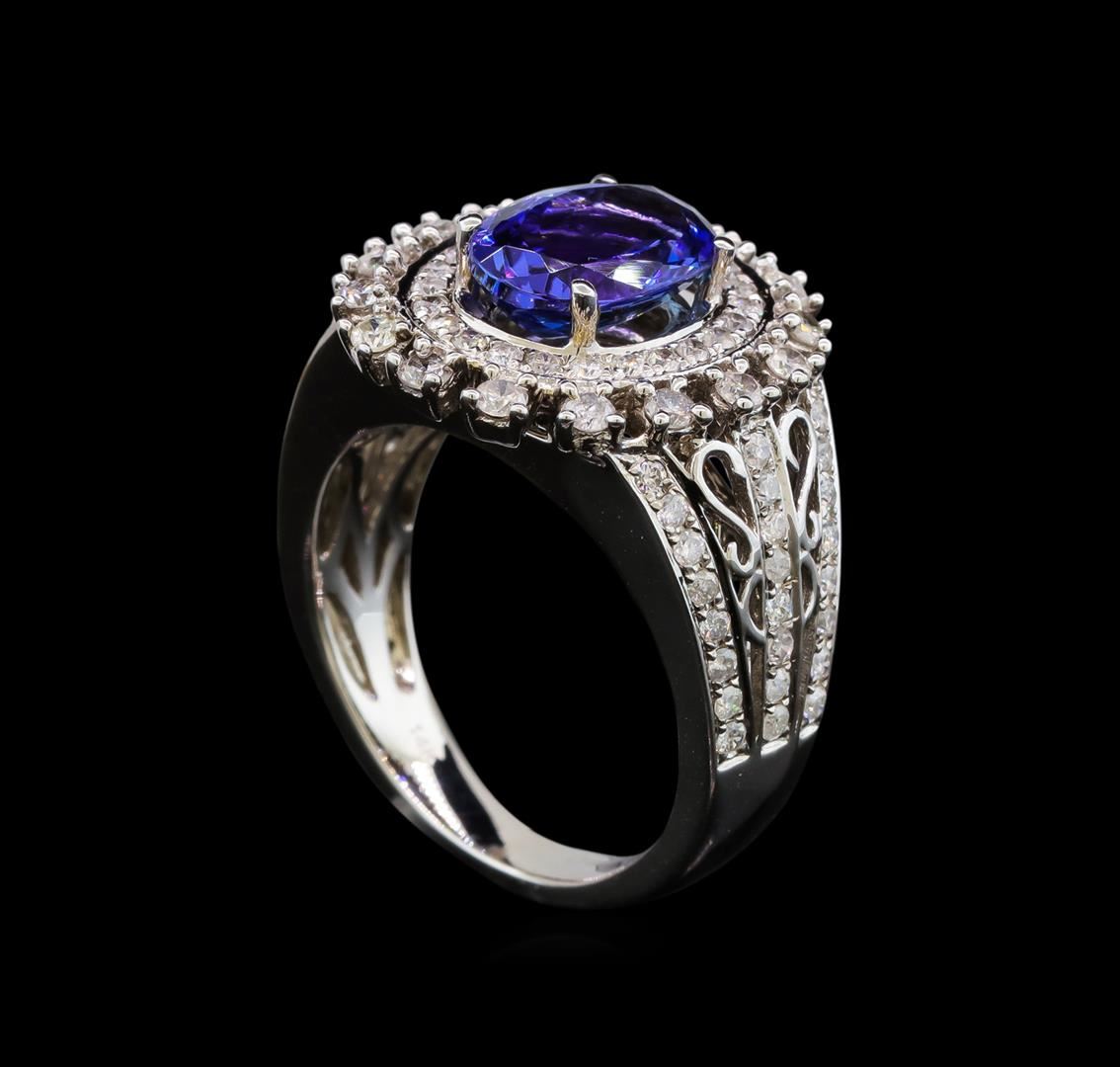 One electronically tested 14KT white gold ladies cast tanzanite and diamond ring with a bright polish finish. Identified with markings of "14K". Condition is new. Containing: One prong set square cushion modified brilliant cut natural tanzanite, measuring 10.30 x 7.00. x 5.62mm, approximate weight of 3.31ct., clarity is eye clean, type I, medium light, very slightly grayish, violet color, (GIA V 4/3), cut is good. Eighty-Seven prong set round brilliant cut diamonds, measuring 1.50 - 1.20 x 0.81mm (depth est.) approximate total weight of 87 Stones = 0.78ct. Clarity: SI-2 to I-2. Color: I - J. All diamonds and colored gemstones are graded in the mounting, unless otherwise stated. Colored gemstones are presumed to have been subjected to commonly used enhancement processes.. Total Weight of Colored Stones 3.31ct. Total Weight of Diamonds 0.78ct. Total Weight of Ring 8.10 grams. GGL Appraised at $6,330.00.