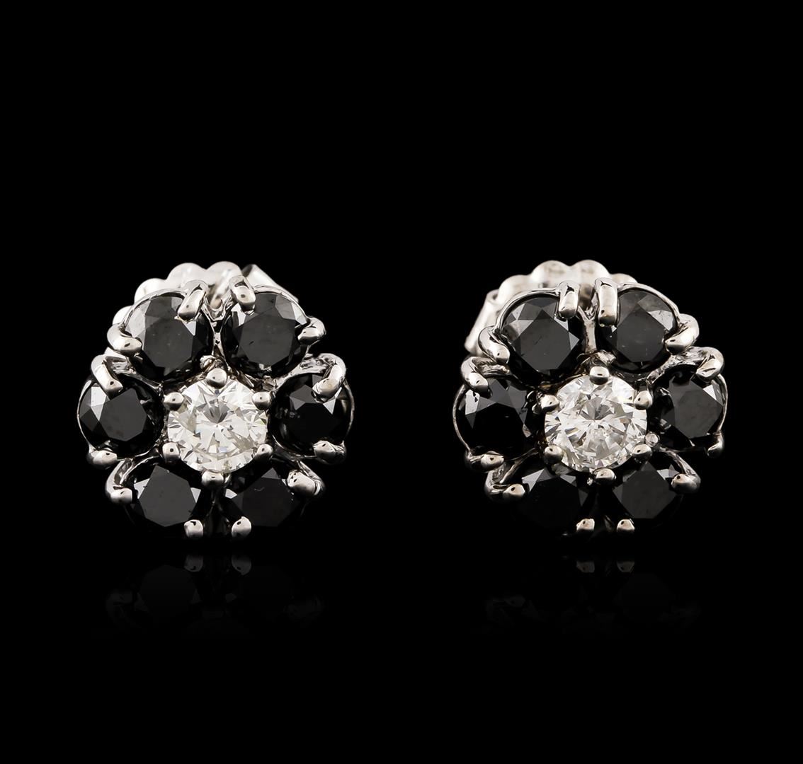 One pair electronically tested 14KT white gold ladies cast & assembled black and white diamond floret earrings with standard backs. Bright polish finish. Condition is good. Containing: Twelve prong set round brilliant cut diamonds, measuring 4.00 - 3.80 x 2.34mm (depth est.) approximate total weight of 12 Stones = 2.70ct. Indications of multiple laboratory enhancements. The specific gravity of black diamond is 3.120 to 3.165. Diamond tester results are non-reactive. Graded in the setting. Clarity Declasse. Color: Fancy Black; Irradiated. Two prong set round brilliant cut diamonds, measuring 4.20 - 4.10 x 2.49mm (depth est.) approximate total weight of 2 Stones = 0.62ct. Graded in the setting. Clarity: SI-2 to I-1. Color: I - J. Total Weight of Diamonds 3.32ct. Total Weight of Earrings 5.02 grams. AIG Appraised at $4,225.00.