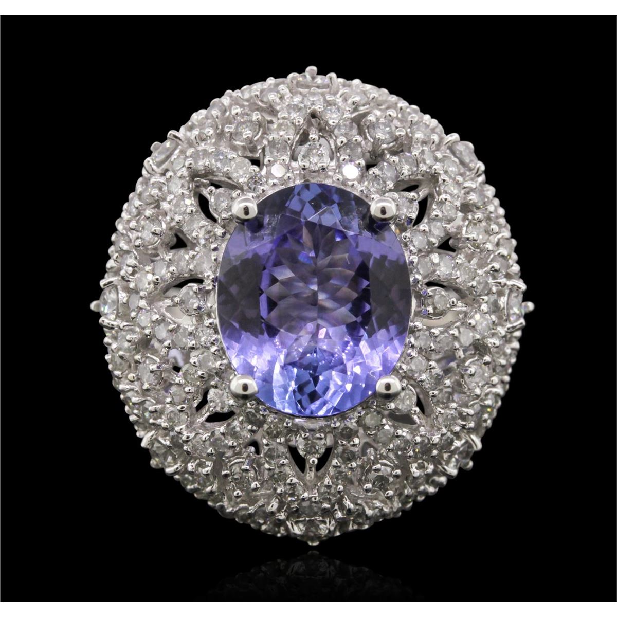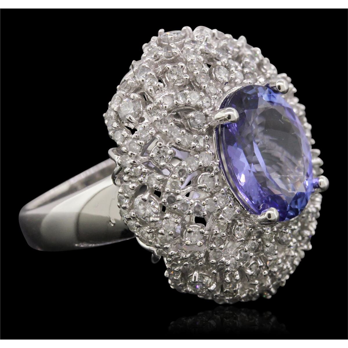 One electronically tested 14KT white gold Ladies combination cast & assembled ring with a bright polish finish. Condition is new. Identified with markings of "K14". Containing: One prong set oval modified brilliant cut natural tanzanite, measuring 11.30 x 9.40 x 4.63mm, approximate weight of 3.32ct., clarity is eye clean, type I, medium light, very slightly grayish, violet color, (GIA V 4/3), cut is good. Colored gemstones are presumed to have been subjected to commonly used color/clarity enhancement processes. One Hundred Sixty-Eight prong set round brilliant cut diamonds, measuring 1.30 - 1.30 x 0.78mm (depth est.) approximate. Total Weight of 168 Stones = 1.34ct. Clarity: I-1 to I-2. Color: I - J, Cut is Good. Eight prong set round brilliant cut diamonds, measuring 2.00 - 2.00 x 1.20mm (depth est.) approximate. Total Weight of 8 Stones = 0.23ct. Clarity: SI-2. Color: I - J, Cut is Good. Total Weight of Colored Stones 3.32ct. Total Weight of Diamonds 1.58ct. Total Weight of Ring 9.40 grams. GGL Appraised at $11,345.00.