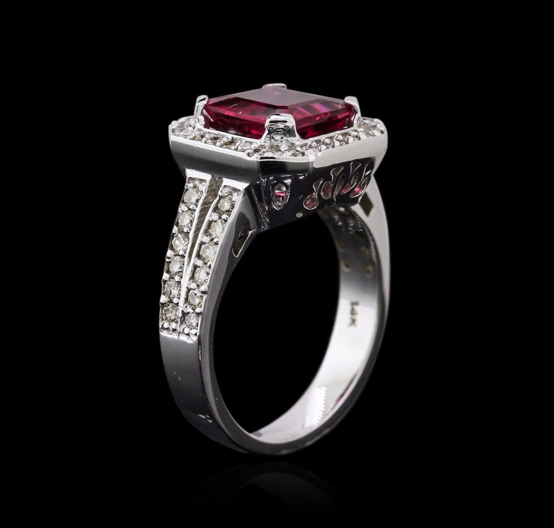 One electronically tested 14KT white gold ladies cast rubellite and diamond ring with a split shoulder shank with a bright polish finish. Identified with markings of "14K". Condition is new. Containing: One prong set emerald standard step cut natural rubellite, measuring 9.20 x 8.21 x 5.34mm, approximate weight of 3.33ct., clarity is slightly included, type III, medium, very slightly grayish, reddish purple color, (GIA rP 5/3), cut is good. Fifty-Four prong set round brilliant cut diamonds, measuring 1.50 - 1.50 x 0.90mm (depth est.) approximate total weight of 54 Stones = 0.66ct. Clarity: I-1 to I-2. Color: J - K, Cut is Good. Diamonds and colored gemstones are graded in the mounting, unless otherwise stated. Colored gemstones are presumed to have been subjected to commonly used enhancement processes. Total Weight of Colored Stones 3.33ct. Total Weight of Diamonds 0.66ct. Total Weight of Ring 7.70 grams. GGL Appraised at $4,335.00.