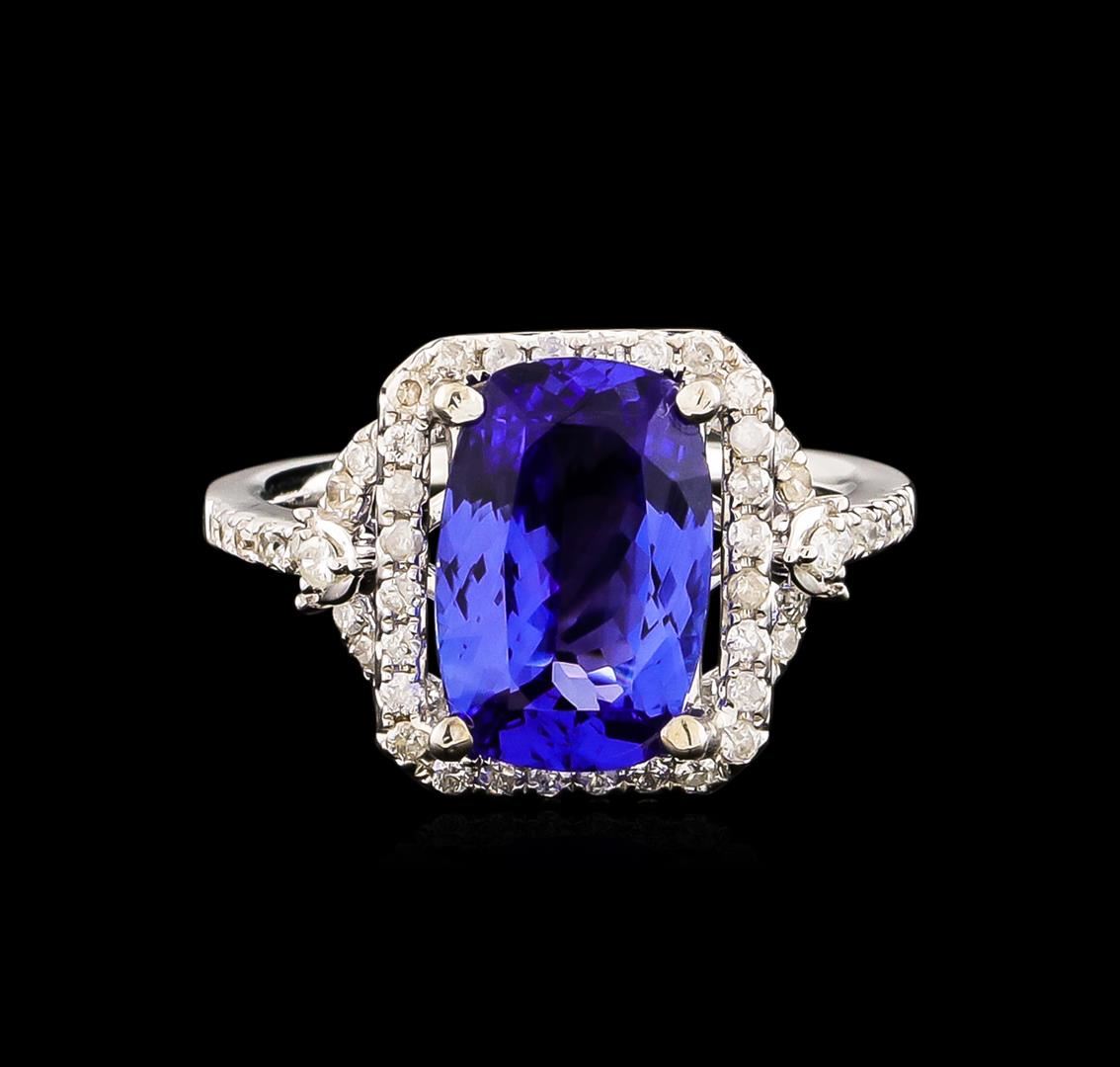 One electronically tested 14KT white gold ladies combination cast & assembled ring with a bright polish finish. Condition is new. Identified with markings of "14K". Containing: One prong set rectangular cushion modified brilliant cut natural tanzanite, measuring 11.90 x 8.90 x 4.00mm, approximate weight of 3.34ct., clarity is eye clean, type I, medium light, moderately strong, bluish violet color, (GIA bV 4/4), cut is good. Fifty-Five prong set round brilliant cut diamonds, measuring 1.50 - 1.30 x 0.84mm (depth est.) approximate total weight of 55 Stones = 0.40ct. Clarity: I-1 to I-2. Color: I - J, Cut is Good. Colored gemstones are presumed to have been subjected to commonly used enhancement processes. All diamonds and colored gemstones are graded in the mounting, unless otherwise stated. Total Weight of Colored Stones 3.34ct. Total Weight of Diamonds 0.40ct. Total Weight of Ring 4.10 grams. GGL Appraised at $6,580.00.