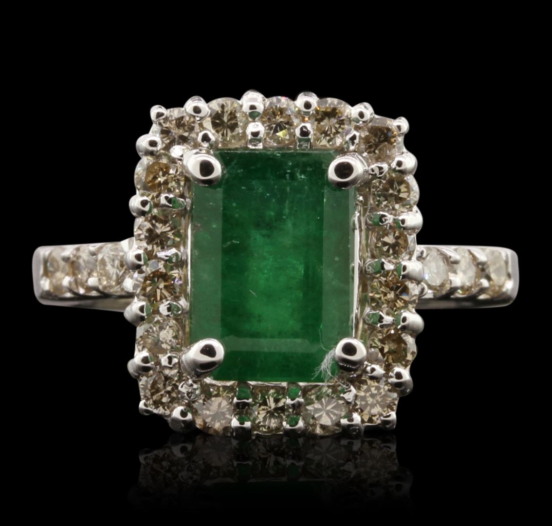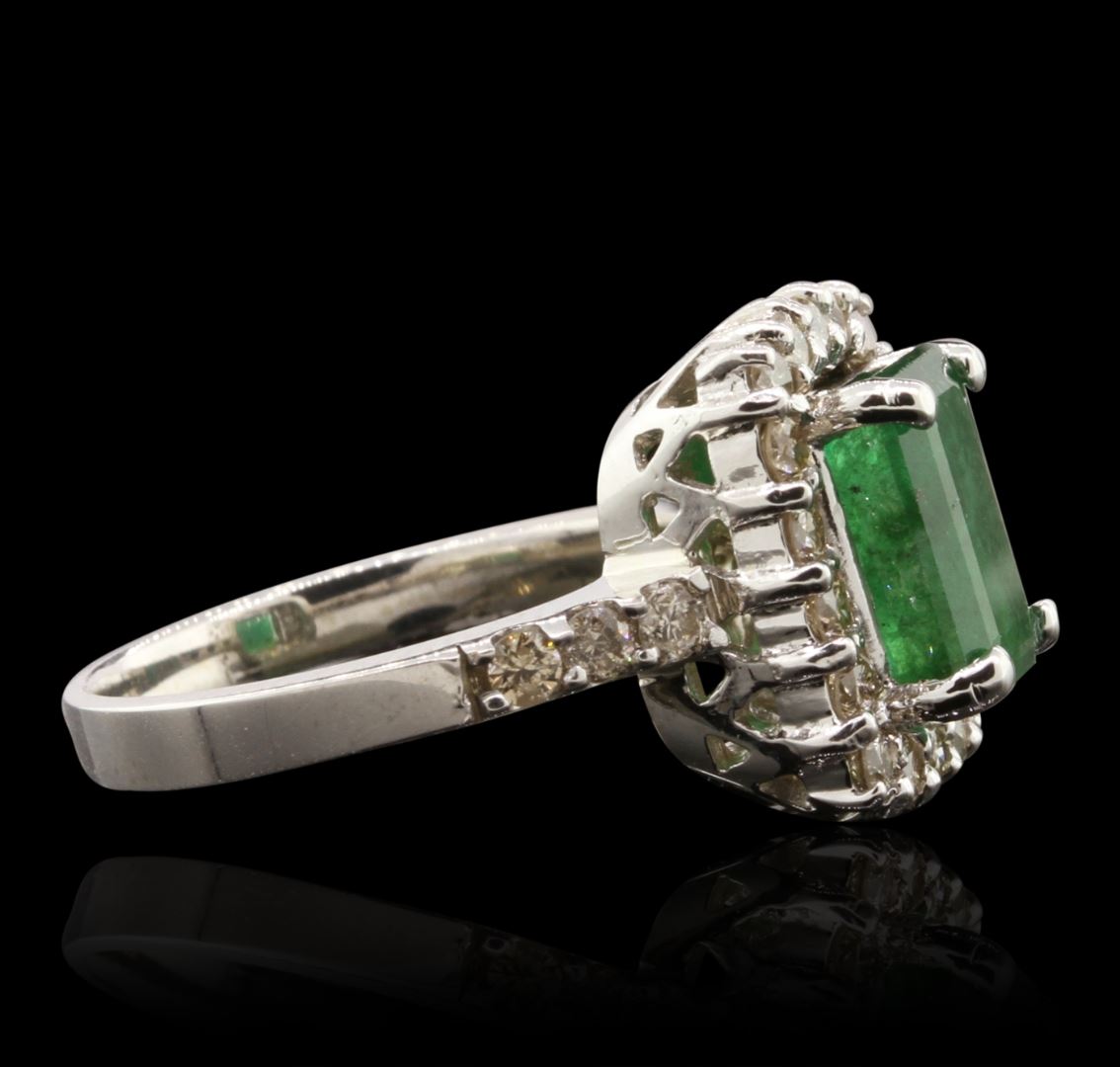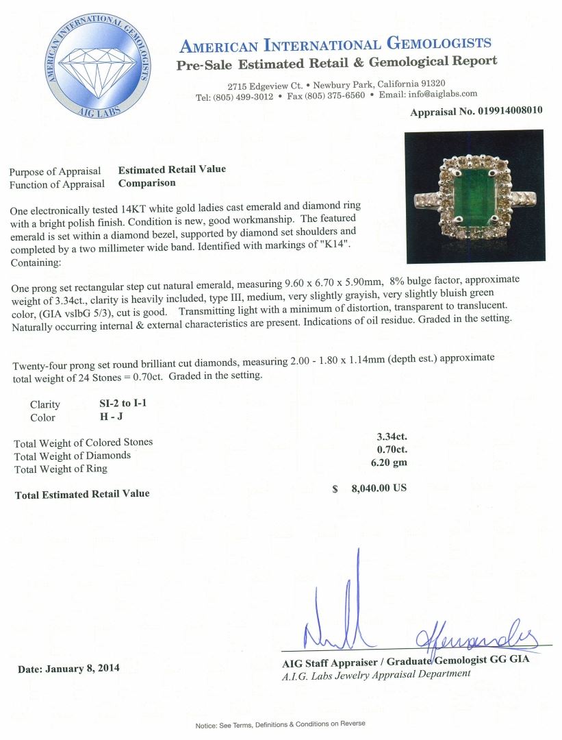 One electronically tested 14KT white gold ladies cast emerald and diamond ring with a bright polish finish. The featured emerald is set within a diamond bezel, supported by diamond set shoulders and completed by a two millimeter wide band. Identified with markings of "K14". Condition is new, good workmanship. Containing: One prong set rectangular step cut natural emerald, measuring 9.60 x 6.70 x 5.90mm, 8%. bulge factor, approximate weight of 3.34ct., clarity is heavily included, type III, medium, very slightly grayish, very slightly bluish green color, (GIA vslbG 5/3), cut is good. Transmitting light with a minimum of distortion, transparent to translucent. Naturally occurring internal & external characteristics are present. Indications of oil residue. Graded in the setting. Twenty-Four prong set round brilliant cut diamonds, measuring 2.00 - 1.80 x 1.14mm (depth est.) approximate. Total Weight of 24 Stones = 0.70ct. Graded in the setting. Clarity: SI-2 to I-1 . Color: H - J. Total Weight of Colored Stones 3.34ct. Total Weight of Diamonds 0.70ct. AIG Appraised at $8,040.00.
