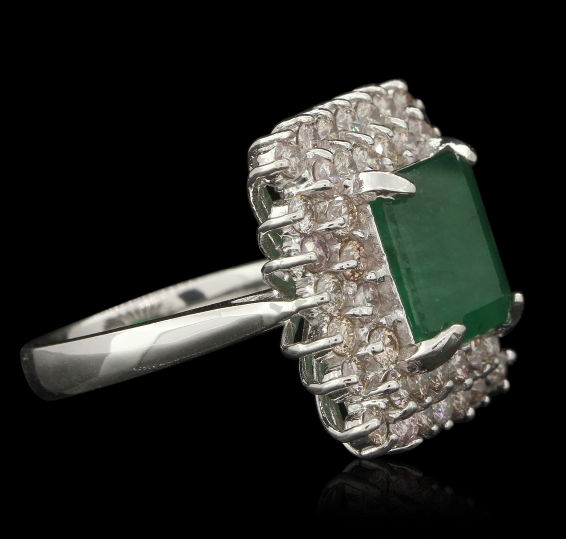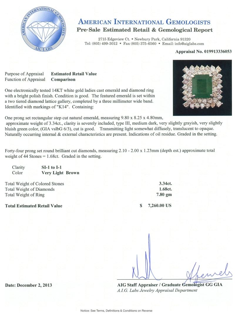 One electronically tested 14KT white gold ladies cast emerald and diamond ring with a bright polish finish. Condition is good. The featured emerald is set within a two tiered diamond lattice gallery, completed by a three millimeter wide band. Identified with markings of "K14". Containing: One prong set rectangular step cut natural emerald, measuring 9.80 x 8.25 x 4.80mm, approximate weight of 3.34ct., clarity is severely included, type III, medium dark, very slightly grayish, very slightly bluish green color, (GIA vslbG 6/3), cut is good. Transmitting light somewhat diffusely, translucent to opaque. Naturally occurring internal & external characteristics are present. Indications of oil residue. Graded in the setting. Forty-four prong set round brilliant cut diamonds, measuring 2.10 - 2.00 x 1.23mm (depth est.) approximate total weight of 44 Stones = 1.68ct. Graded in the setting. Clarity SI-1 to I-1. Color Very Light Brown. Total Weight of Colored Stones 3.34ct. Total Weight of Diamonds 1.68ct. Total Weight of Ring 7.80gm. AIG Appraised at $7,260.00.