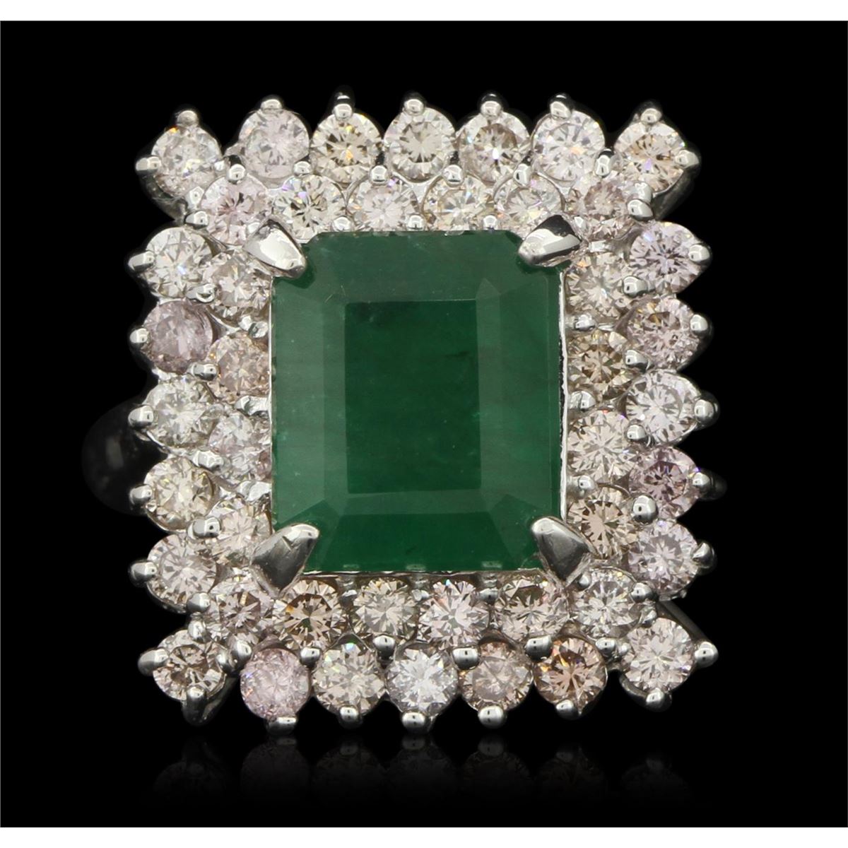 One electronically tested 14KT white gold ladies cast emerald and diamond ring with a bright polish finish. Condition is good. The featured emerald is set within a two tiered diamond lattice gallery, completed by a three millimeter wide band. Identified with markings of "K14". Containing: One prong set rectangular step cut natural emerald, measuring 9.80 x 8.25 x 4.80mm, approximate weight of 3.34ct., clarity is severely included, type III, medium dark, very slightly grayish, very slightly bluish green color, (GIA vslbG 6/3), cut is good. Transmitting light somewhat diffusely, translucent to opaque. Naturally occurring internal & external characteristics are present. Indications of oil residue. Graded in the setting. Forty-four prong set round brilliant cut diamonds, measuring 2.10 - 2.00 x 1.23mm (depth est.) approximate total weight of 44 Stones = 1.68ct. Graded in the setting. Clarity SI-1 to I-1. Color Very Light Brown. Total Weight of Colored Stones 3.34ct. Total Weight of Diamonds 1.68ct. Total Weight of Ring 7.80gm. AIG Appraised at $7,260.00.
