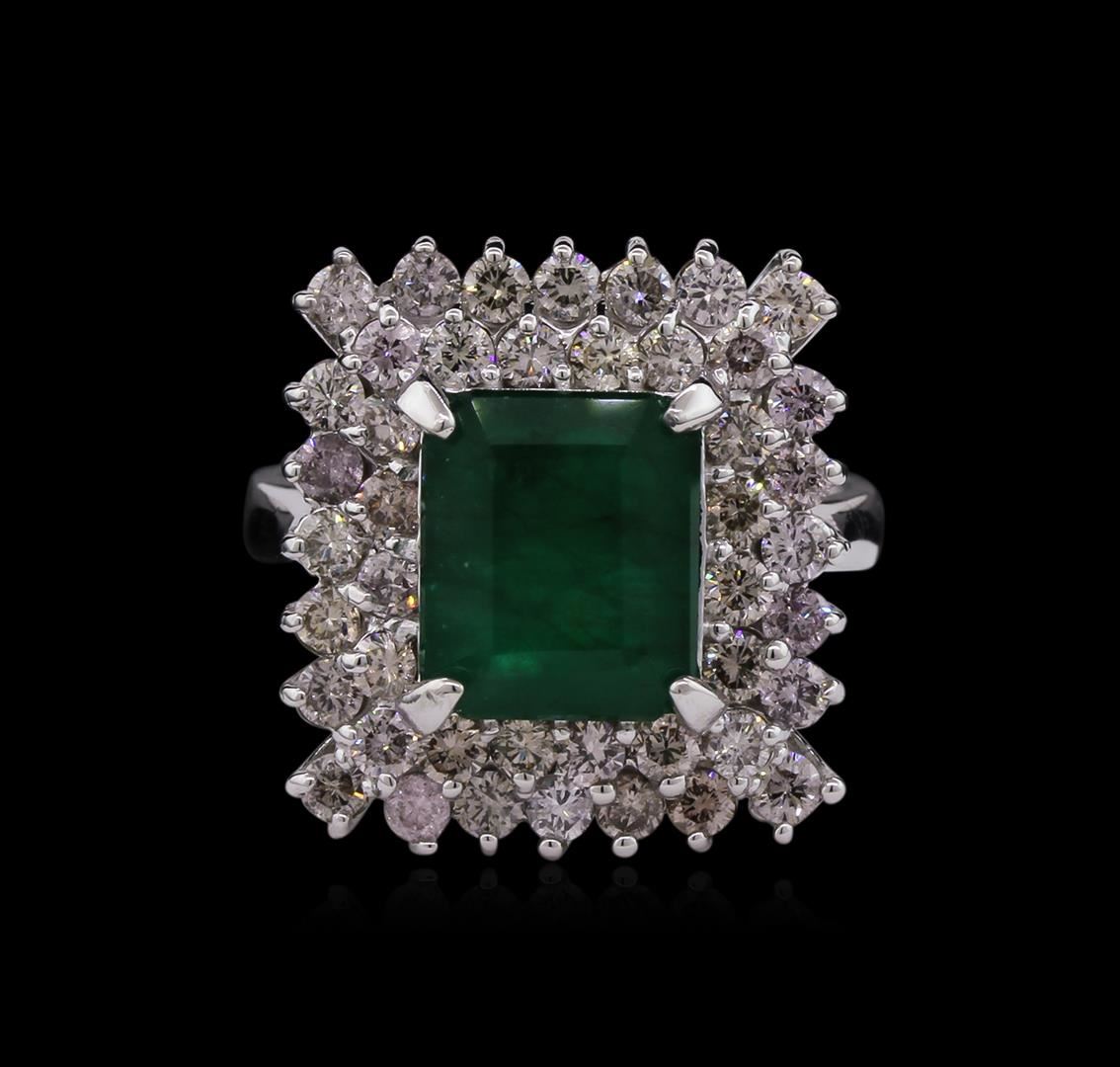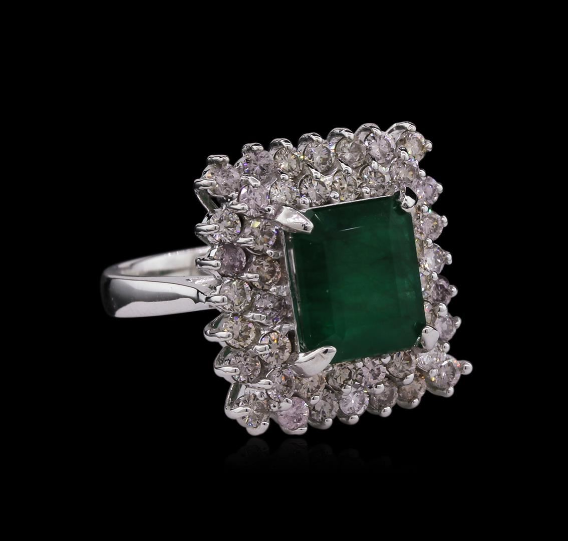 One electronically tested 14KT white gold ladies cast emerald and diamond ring with a bright polish finish. Condition is good. The featured emerald is set within a two tiered diamond lattice gallery, completed by a three millimeter wide band. Identified with markings of "K14". Containing: One prong set rectangular step cut natural emerald, measuring 9.80 x 8.25 x 4.80mm, approximate weight of 3.34ct., clarity is severely included, type III, medium dark, very slightly grayish, very slightly bluish green color, (GIA vslbG 6/3), cut is good. Transmitting light somewhat diffusely, translucent to opaque. Naturally occurring internal & external characteristics are present. Indications of oil residue. Graded in the setting. Forty-four prong set round brilliant cut diamonds, measuring 2.10 - 2.00 x 1.23mm (depth est.) approximate total weight of 44 Stones = 1.68ct. Graded in the setting. Clarity SI-1 to I-1. Color Very Light Brown. Total Weight of Colored Stones 3.34ct. Total Weight of Diamonds 1.68ct. Total Weight of Ring 7.80gm. AIG Appraised at $7,260.00.
