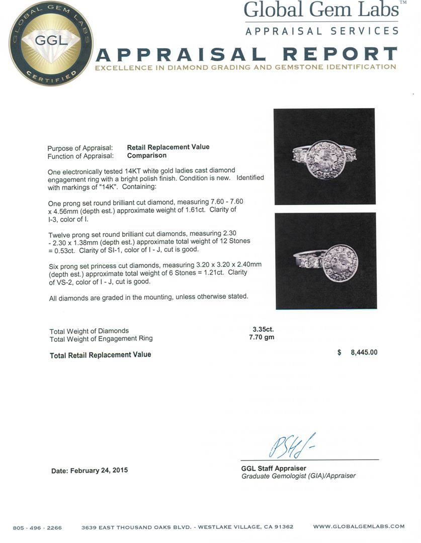One electronically tested 14KT white gold ladies cast diamond engagement ring with a bright polish finish. Identified with markings of "14K". Condition is new. Containing: One prong set round brilliant cut diamond, measuring 7.60 - 7.60 x 4.56mm (depth est.) approximate weight of 1.61ct. Clarity: I-3. Color: I. Twelve prong set round brilliant cut diamonds, measuring 2.30 - 2.30 x 1.38mm (depth est.) approximate total weight of 12 Stones = 0.53ct. Clarity: SI-1. Color: I - J, Cut is Good. Six prong set princess cut diamonds, measuring 3.20 x 3.20 x 2.40mm (depth est.) approximate total weight of 6 Stones = 1.21ct. Clarity: VS-2. Color: I - J, Cut is Good. All diamonds are graded in the mounting, unless otherwise stated. Total Weight of Diamonds 3.35ct. Total Weight of Engagement Ring 7.70 grams. GGL Appraised at $8,445.00.