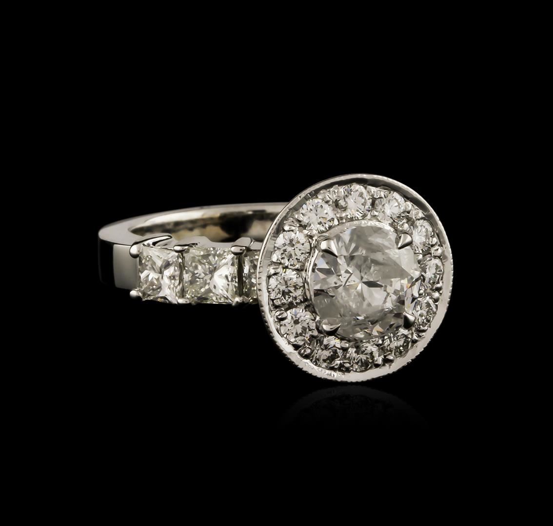 One electronically tested 14KT white gold ladies cast diamond engagement ring with a bright polish finish. Identified with markings of "14K". Condition is new. Containing: One prong set round brilliant cut diamond, measuring 7.60 - 7.60 x 4.56mm (depth est.) approximate weight of 1.61ct. Clarity: I-3. Color: I. Twelve prong set round brilliant cut diamonds, measuring 2.30 - 2.30 x 1.38mm (depth est.) approximate total weight of 12 Stones = 0.53ct. Clarity: SI-1. Color: I - J, Cut is Good. Six prong set princess cut diamonds, measuring 3.20 x 3.20 x 2.40mm (depth est.) approximate total weight of 6 Stones = 1.21ct. Clarity: VS-2. Color: I - J, Cut is Good. All diamonds are graded in the mounting, unless otherwise stated. Total Weight of Diamonds 3.35ct. Total Weight of Engagement Ring 7.70 grams. GGL Appraised at $8,445.00.
