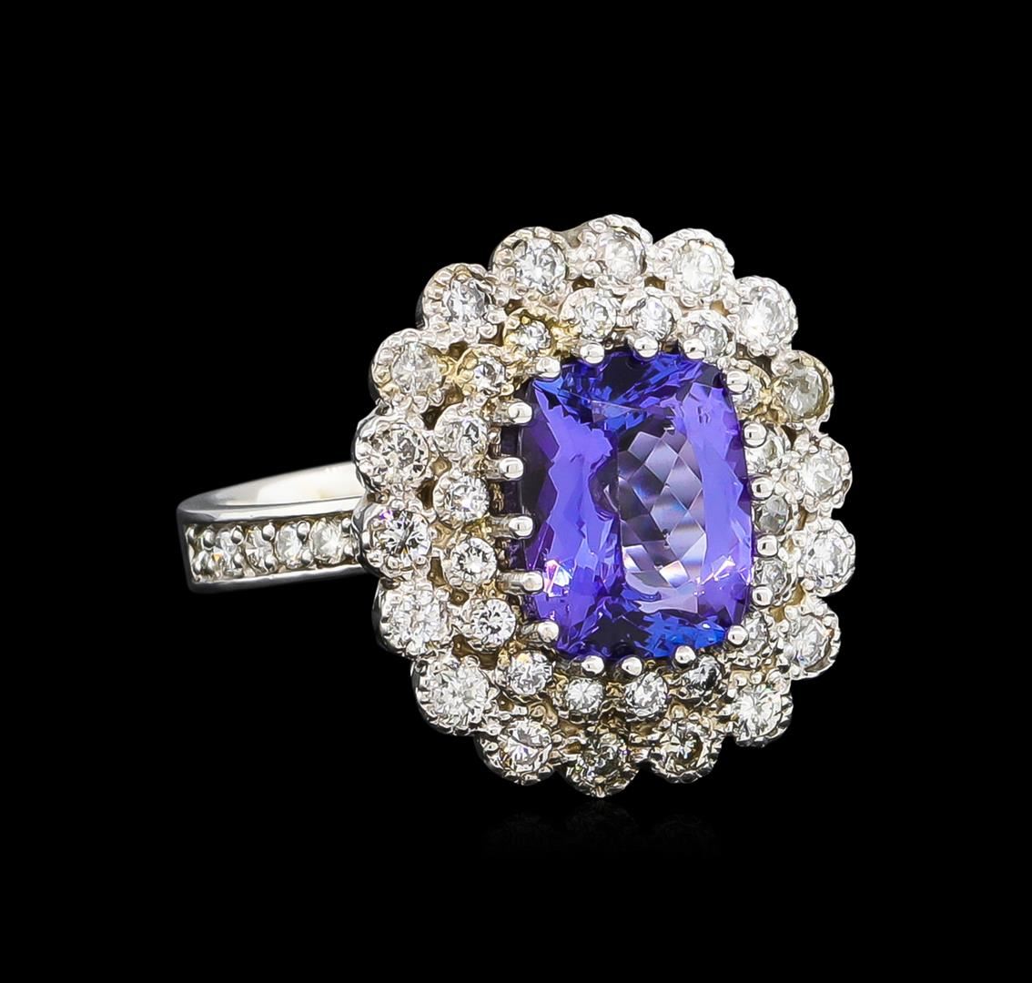 One electronically tested 14KT white gold Ladies combination cast & assembled ring with a bright polish finish. Condition is new. Identified with markings of "K14". Containing: One prong set rectangular cushion modified brilliant cut natural tanzanite, measuring 10.21 x 8.50 x 4.90mm, approximate weight of 3.35ct., clarity is eye clean, type I, medium light, very slightly grayish, violet color, (GIA V 4/3), cut is very good. Colored gemstones are presumed to have been subjected to commonly used color/clarity enhancement processes. Forty-Eight prong set round brilliant cut diamonds, measuring 1.80 - 1.50 x 0.55mm (depth est.) approximate. Total Weight of 48 Stones = 0.44ct. Clarity: I-1 to I-2. Color: J - K, Cut is Good. Total Weight of Colored Stones 3.35ct. Total Weight of Diamonds 0.44ct. Total Weight of Ring 7.50 grams. GGL Appraised at $7,510.00.