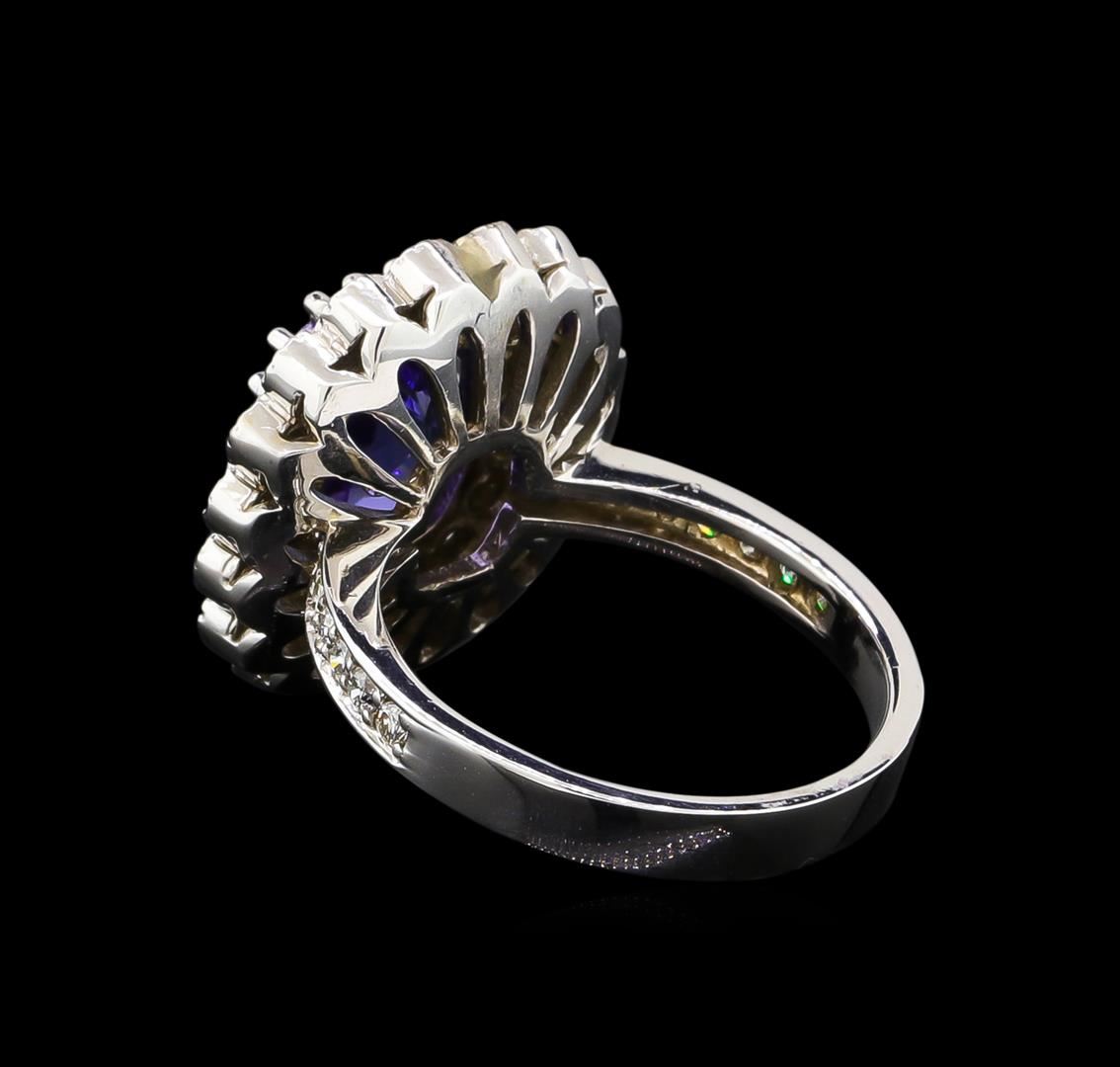 One electronically tested 14KT white gold Ladies combination cast & assembled ring with a bright polish finish. Condition is new. Identified with markings of "K14". Containing: One prong set rectangular cushion modified brilliant cut natural tanzanite, measuring 10.21 x 8.50 x 4.90mm, approximate weight of 3.35ct., clarity is eye clean, type I, medium light, very slightly grayish, violet color, (GIA V 4/3), cut is very good. Colored gemstones are presumed to have been subjected to commonly used color/clarity enhancement processes. Forty-Eight prong set round brilliant cut diamonds, measuring 1.80 - 1.50 x 0.55mm (depth est.) approximate. Total Weight of 48 Stones = 0.44ct. Clarity: I-1 to I-2. Color: J - K, Cut is Good. Total Weight of Colored Stones 3.35ct. Total Weight of Diamonds 0.44ct. Total Weight of Ring 7.50 grams. GGL Appraised at $7,510.00.