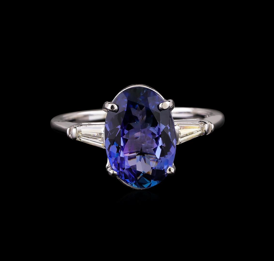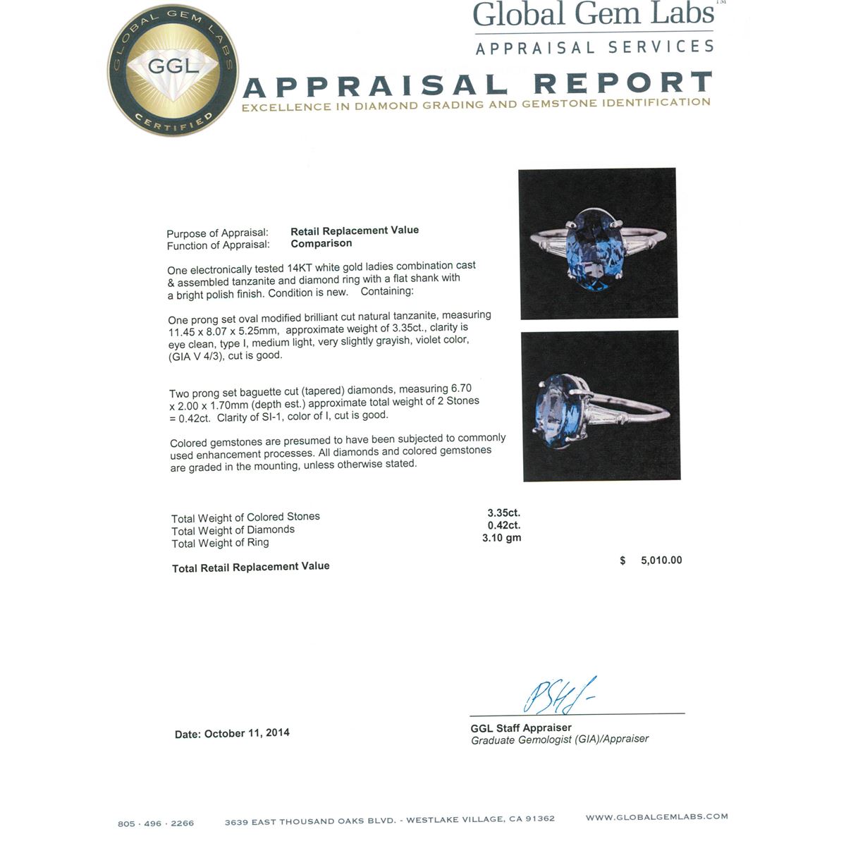 One electronically tested 14KT white gold ladies combination cast & assembled tanzanite and diamond ring with a flat shank with a bright polish finish. Condition is new. Containing: One prong set oval modified brilliant cut natural tanzanite, measuring 11.45 x 8.07 x 5.25mm, approximate weight of 3.35ct., clarity is eye clean, type I, medium light, very slightly grayish, violet color, (GIA V 4/3), cut is good. Two prong set baguette cut (tapered) diamonds, measuring 6.70 x 2.00 x 1.70mm (depth est.) approximate total weight of 2 Stones = 0.42ct. Clarity: SI-1. Color: I, Cut is Good. Colored gemstones are presumed to have been subjected to commonly used enhancement processes. All diamonds and colored gemstones are graded in the mounting, unless otherwise stated. Total Weight of Colored Stones 3.35ct. Total Weight of Diamonds 0.42ct. Total Weight of Ring 3.10 grams. GGL Appraised at $5,010.00.