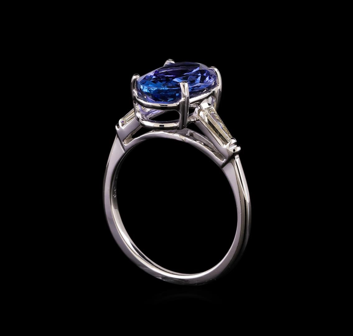 One electronically tested 14KT white gold ladies combination cast & assembled tanzanite and diamond ring with a flat shank with a bright polish finish. Condition is new. Containing: One prong set oval modified brilliant cut natural tanzanite, measuring 11.45 x 8.07 x 5.25mm, approximate weight of 3.35ct., clarity is eye clean, type I, medium light, very slightly grayish, violet color, (GIA V 4/3), cut is good. Two prong set baguette cut (tapered) diamonds, measuring 6.70 x 2.00 x 1.70mm (depth est.) approximate total weight of 2 Stones = 0.42ct. Clarity: SI-1. Color: I, Cut is Good. Colored gemstones are presumed to have been subjected to commonly used enhancement processes. All diamonds and colored gemstones are graded in the mounting, unless otherwise stated. Total Weight of Colored Stones 3.35ct. Total Weight of Diamonds 0.42ct. Total Weight of Ring 3.10 grams. GGL Appraised at $5,010.00.