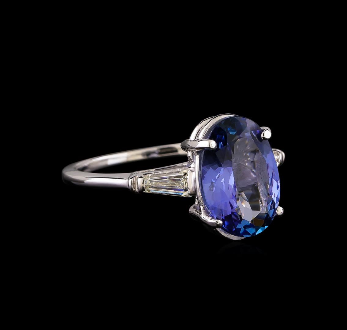 One electronically tested 14KT white gold ladies combination cast & assembled tanzanite and diamond ring with a flat shank with a bright polish finish. Condition is new. Containing: One prong set oval modified brilliant cut natural tanzanite, measuring 11.45 x 8.07 x 5.25mm, approximate weight of 3.35ct., clarity is eye clean, type I, medium light, very slightly grayish, violet color, (GIA V 4/3), cut is good. Two prong set baguette cut (tapered) diamonds, measuring 6.70 x 2.00 x 1.70mm (depth est.) approximate total weight of 2 Stones = 0.42ct. Clarity: SI-1. Color: I, Cut is Good. Colored gemstones are presumed to have been subjected to commonly used enhancement processes. All diamonds and colored gemstones are graded in the mounting, unless otherwise stated. Total Weight of Colored Stones 3.35ct. Total Weight of Diamonds 0.42ct. Total Weight of Ring 3.10 grams. GGL Appraised.