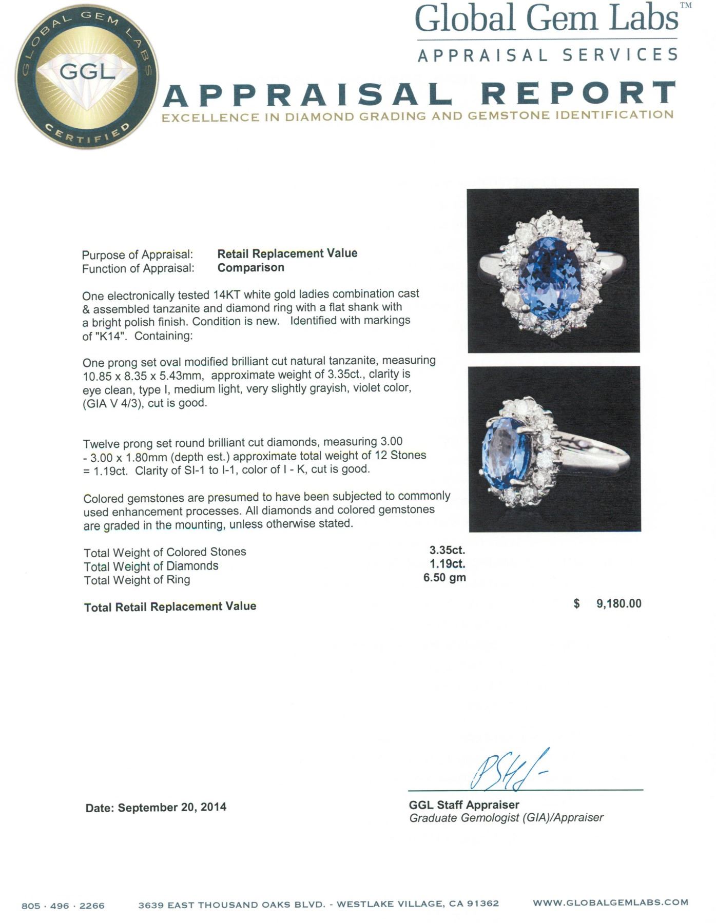One electronically tested 14KT white gold ladies combination cast & assembled tanzanite and diamond ring with a flat shank with a bright polish finish. Identified with markings of "K14". Condition is new. Containing: One prong set oval modified brilliant cut natural tanzanite, measuring 10.85 x 8.35 x 5.43mm, approximate weight of 3.35ct., clarity is eye clean, type I, medium light, very slightly grayish, violet color, (GIA V 4/3), cut is good. Twelve prong set round brilliant cut diamonds, measuring 3.00 - 3.00 x 1.80mm (depth est.) approximate total weight of 12 Stones = 1.19ct. Clarity: SI-1 to I-1. Color: I - K, Cut is Good. Colored gemstones are presumed to have been subjected to commonly used enhancement processes. All diamonds and colored gemstones are graded in the mounting, unless otherwise stated. Total Weight of Colored Stones 3.35ct. Total Weight of Diamonds 1.19ct. Total Weight of Ring 6.50 grams. GGL Appraised.