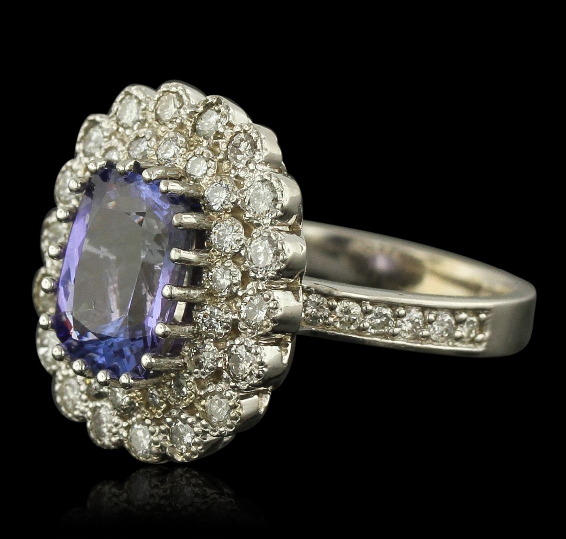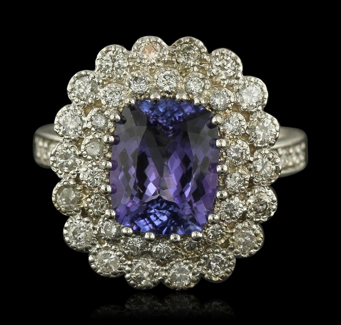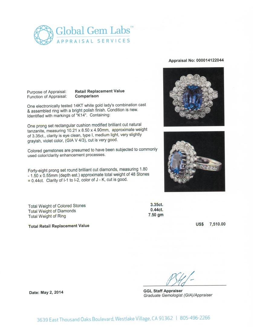One electronically tested 14KT white gold Ladies combination cast & assembled ring with a bright polish finish. Condition is new. Identified with markings of "K14". Containing: One prong set rectangular cushion modified brilliant cut natural tanzanite, measuring 10.21 x 8.50 x 4.90mm, approximate weight of 3.35ct., clarity is eye clean, type I, medium light, very slightly grayish, violet color, (GIA V 4/3), cut is very good. Colored gemstones are presumed to have been subjected to commonly used color/clarity enhancement processes. Forty-Eight prong set round brilliant cut diamonds, measuring 1.80 - 1.50 x 0.55mm (depth est.) approximate. Total Weight of 48 Stones = 0.44ct. Clarity: I-1 to I-2. Color: J - K, Cut is Good. Total Weight of Colored Stones 3.35ct. Total Weight of Diamonds 0.44ct. Total Weight of Ring 7.50 grams. GGL Appraised at $7,510.00.