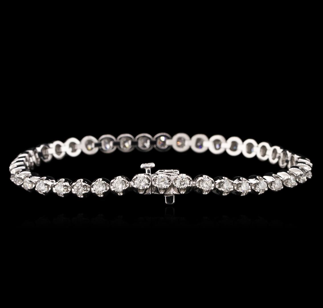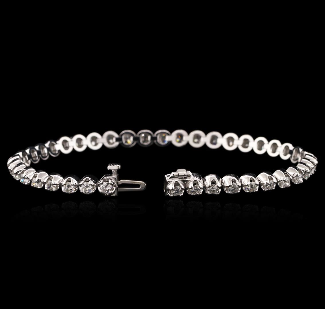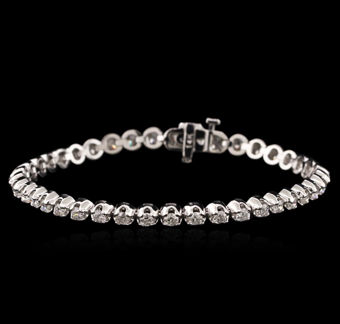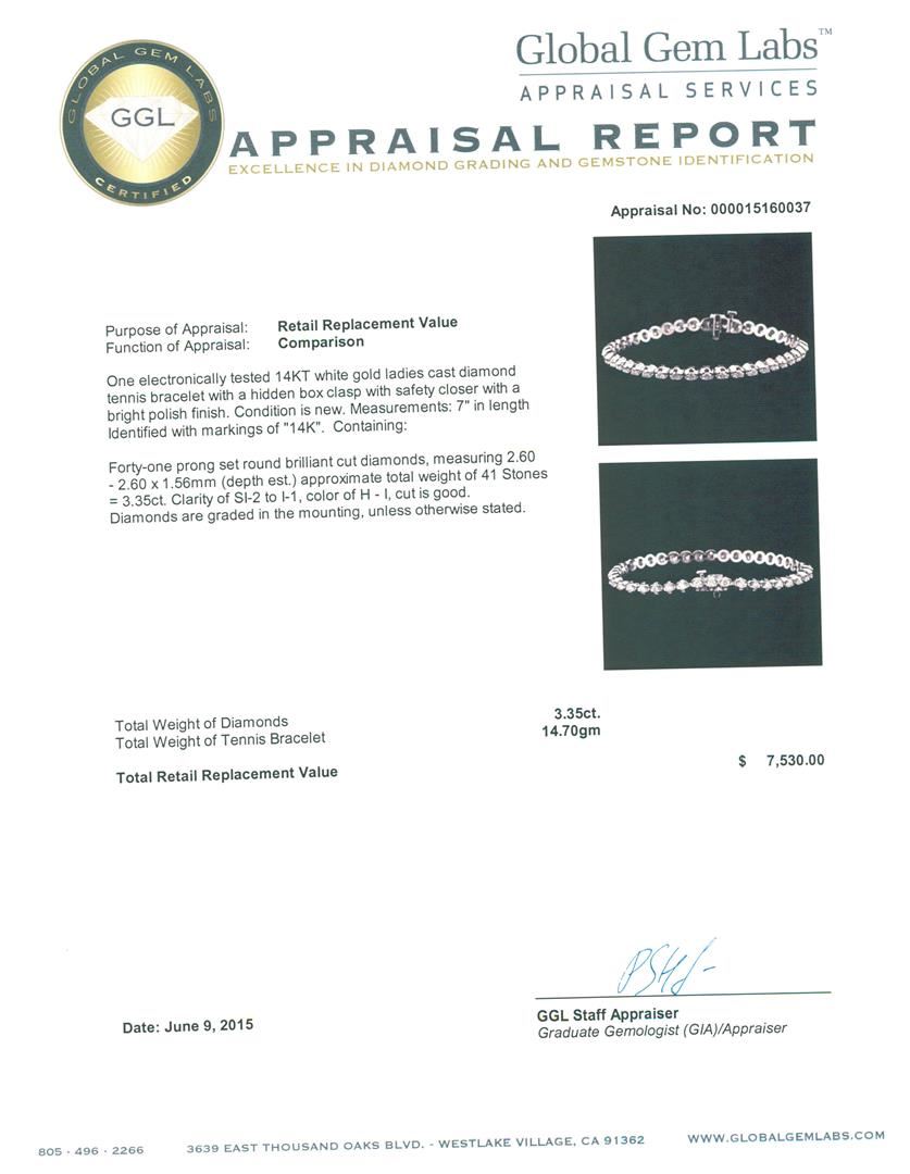 One electronically tested 14KT white gold ladies cast diamond tennis bracelet with a hidden box clasp with safety closer with a bright polish finish. Measurements: 7" in length Identified with markings of "14K". Condition is new. Containing: Forty-One prong set round brilliant cut diamonds, measuring 2.60 - 2.60 x 1.56mm (depth est.) approximate total weight of 41 Stones = 3.35ct. Clarity: SI-2 to I-1. Color: H - I, Cut is Good. Diamonds are graded in the mounting, unless otherwise stated. Total Weight of Diamonds 3.35ct. Total Weight of Tennis Bracelet 14.70 grams. GGL Appraised at $7,530.00.