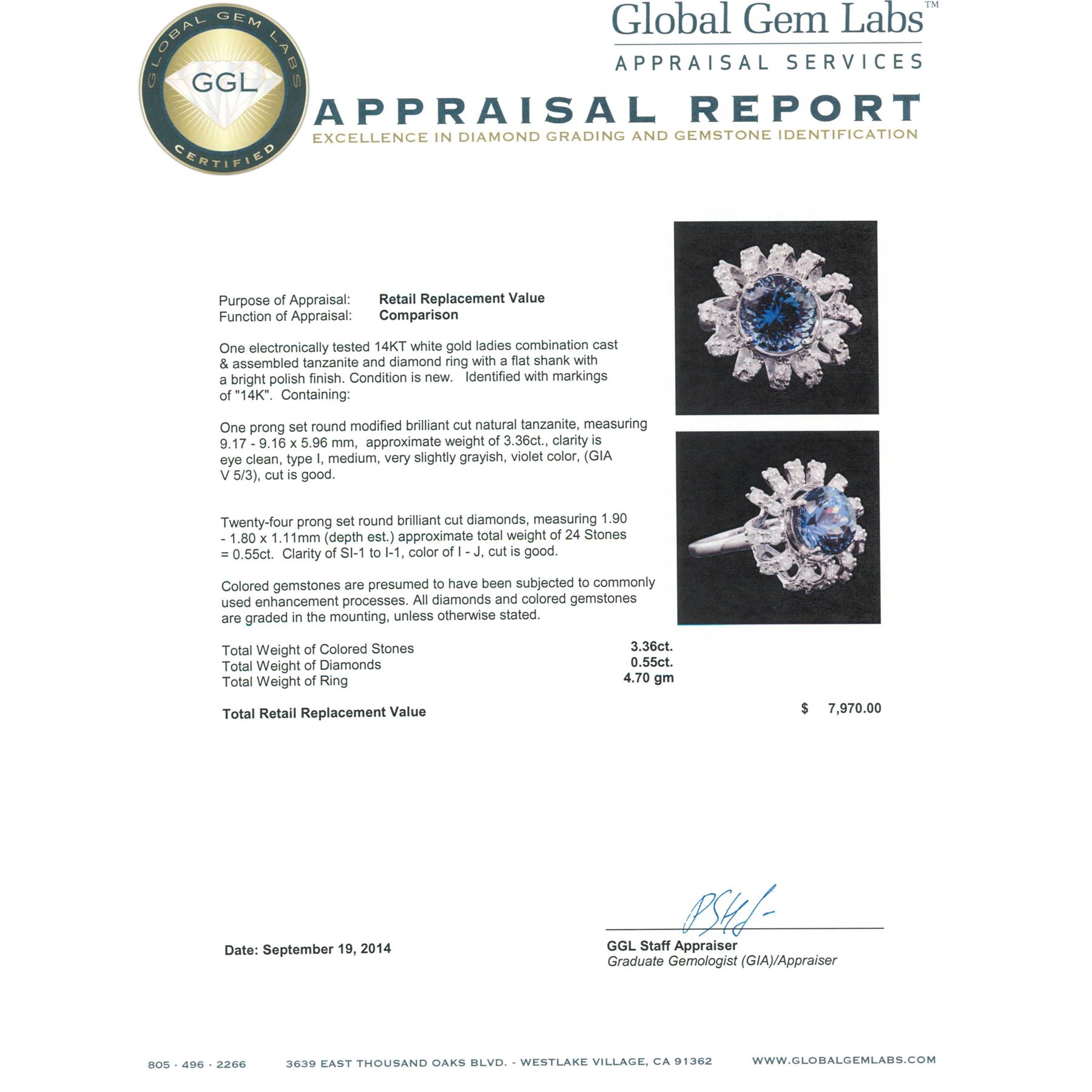 One electronically tested 14KT white gold ladies combination cast & assembled tanzanite and diamond ring with a flat shank with a bright polish finish. Identified with markings of "14K". Condition is new. Containing: One prong set round modified brilliant cut natural tanzanite, measuring 9.17 - 9.16 x 5.96 mm, approximate weight of 3.36ct., clarity is eye clean, type I, medium, very slightly grayish, violet color, (GIA V 5/3), cut is good. Twenty-Four prong set round brilliant cut diamonds, measuring 1.90 - 1.80 x 1.11mm (depth est.) approximate total weight of 24 Stones = 0.55ct. Clarity: SI-1 to I-1. Color: I - J, Cut is Good. Colored gemstones are presumed to have been subjected to commonly used enhancement processes. All diamonds and colored gemstones are graded in the mounting, unless otherwise stated. Total Weight of Colored Stones 3.36ct. Total Weight of Diamonds 0.55ct. Total Weight of Ring 4.70 grams. GGL Appraised at $7,970.00.