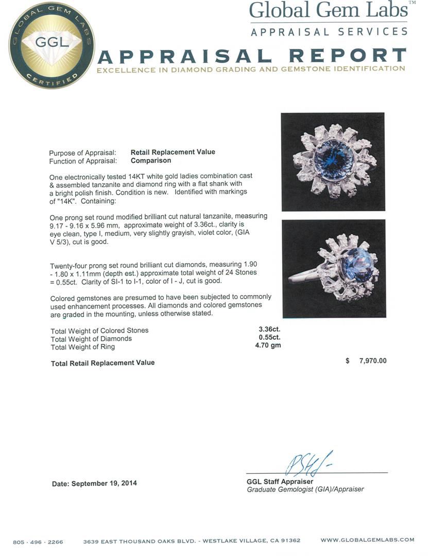 One electronically tested 14KT white gold ladies combination cast & assembled tanzanite and diamond ring with a flat shank with a bright polish finish. Identified with markings of "14K". Condition is new. Containing: One prong set round modified brilliant cut natural tanzanite, measuring 9.17 - 9.16 x 5.96 mm, approximate weight of 3.36ct., clarity is eye clean, type I, medium, very slightly grayish, violet color, (GIA V 5/3), cut is good. Twenty-Four prong set round brilliant cut diamonds, measuring 1.90 - 1.80 x 1.11mm (depth est.) approximate total weight of 24 Stones = 0.55ct. Clarity: SI-1 to I-1. Color: I - J, Cut is Good. Colored gemstones are presumed to have been subjected to commonly used enhancement processes. All diamonds and colored gemstones are graded in the mounting, unless otherwise stated. Total Weight of Colored Stones 3.36ct. Total Weight of Diamonds 0.55ct. Total Weight of Ring 4.70 grams. GGL Appraised.