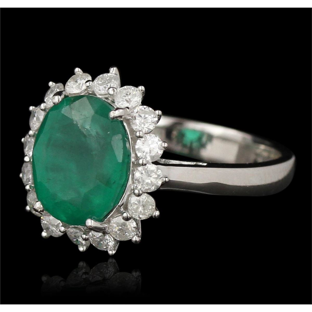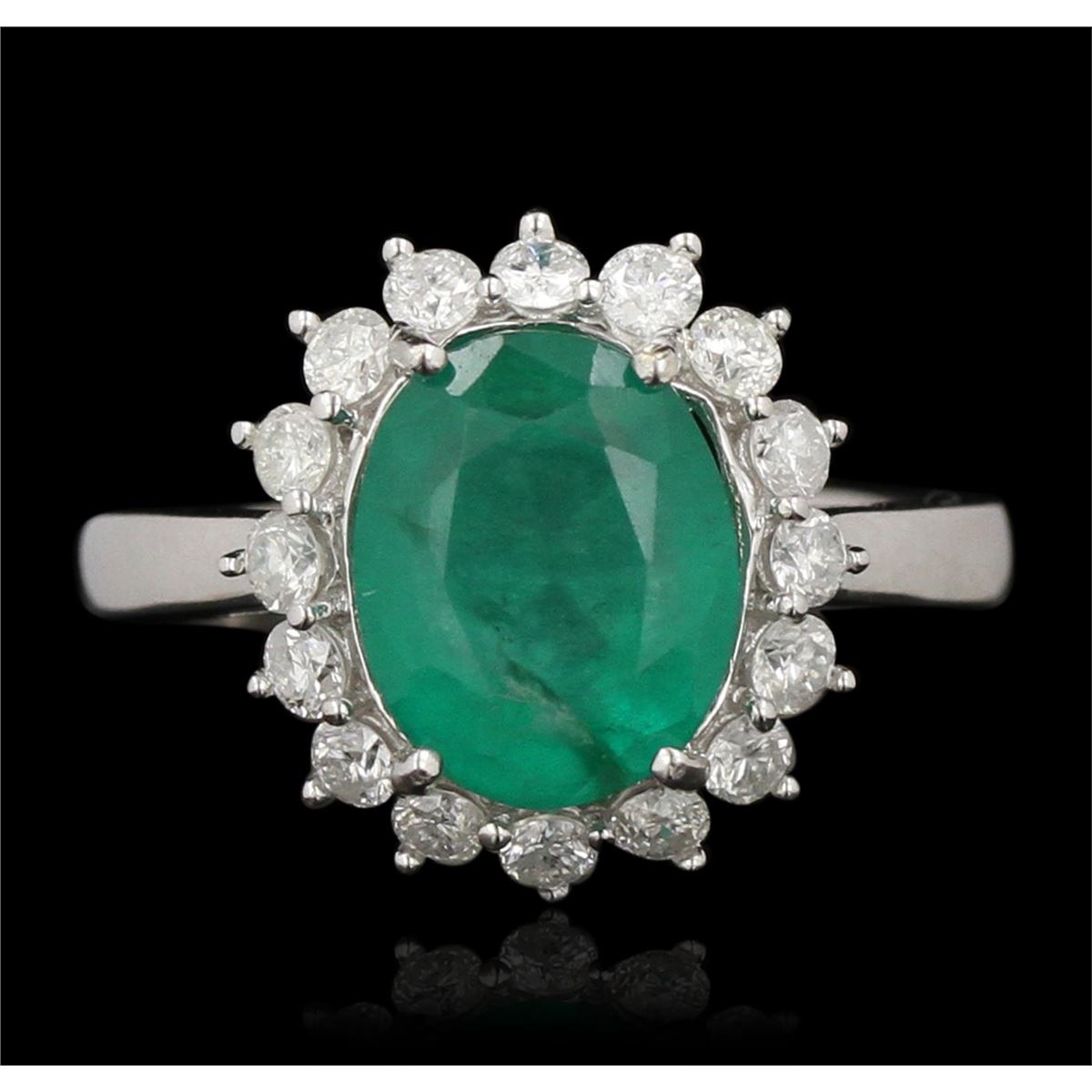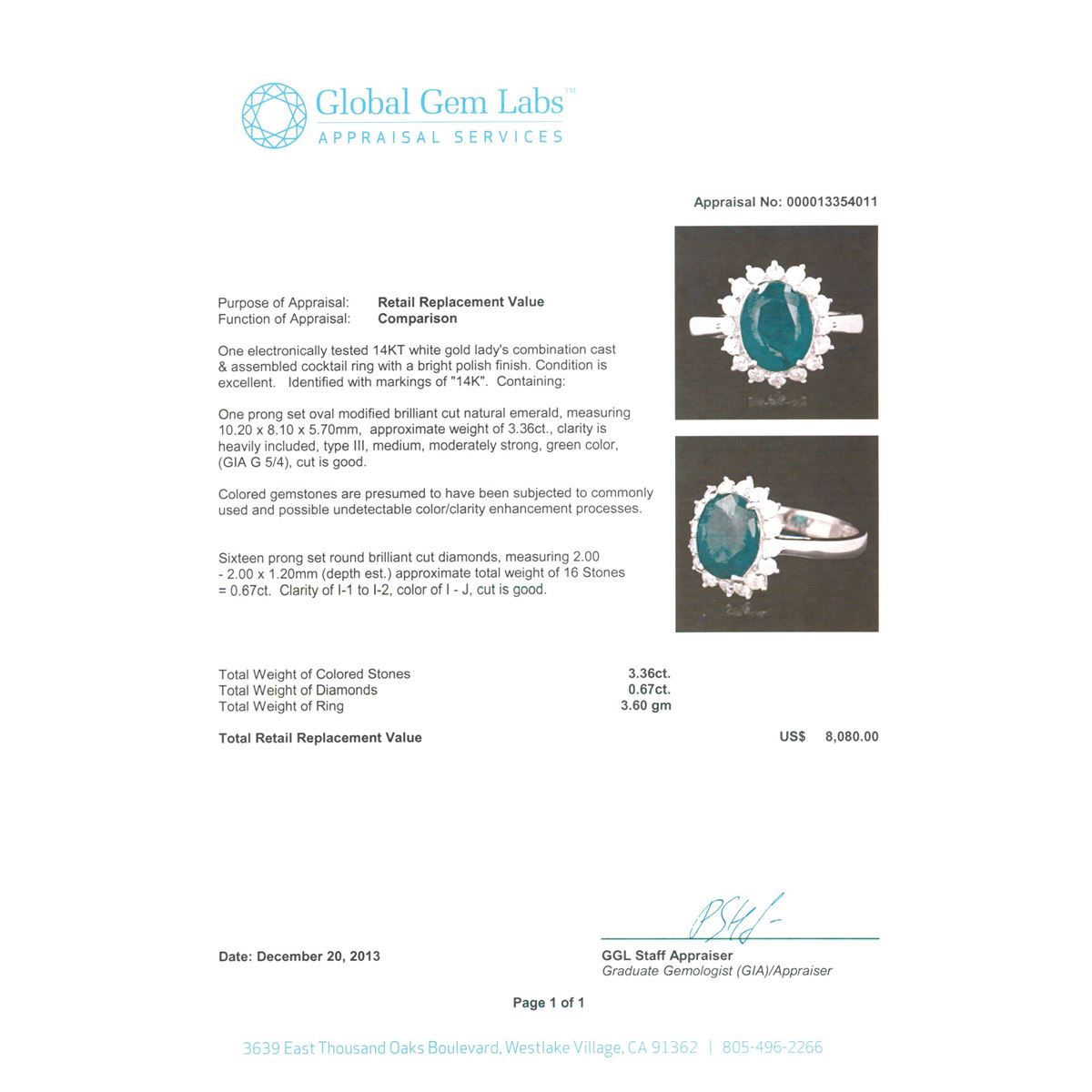 One electronically tested 14KT white gold Ladies combination cast & assembled cocktail ring with a bright polish finish. Identified with markings of "14K". Condition is excellent. Containing: One prong set oval modified brilliant cut natural emerald, measuring 10.20 x 8.10 x 5.70mm, approximate weight of 3.36ct., clarity is heavily included, type III, medium, moderately strong, green color, (GIA G 5/4), cut is good. Colored gemstones are presumed to have been subjected to commonly used and possible undetectable color/clarity enhancement processes. Sixteen prong set round brilliant cut diamonds, measuring 2.00 - 2.00 x 1.20mm (depth est.) approximate total weight of 16 Stones = 0.67ct. Clarity of I-1 to I-2, Color of I - J, Cut is Good. Total Weight of Colored Stones 3.36ct. Total Weight of Diamonds 0.67ct. Total Weight of Ring 3.60gm. GGL Appraised at $8,080.00.