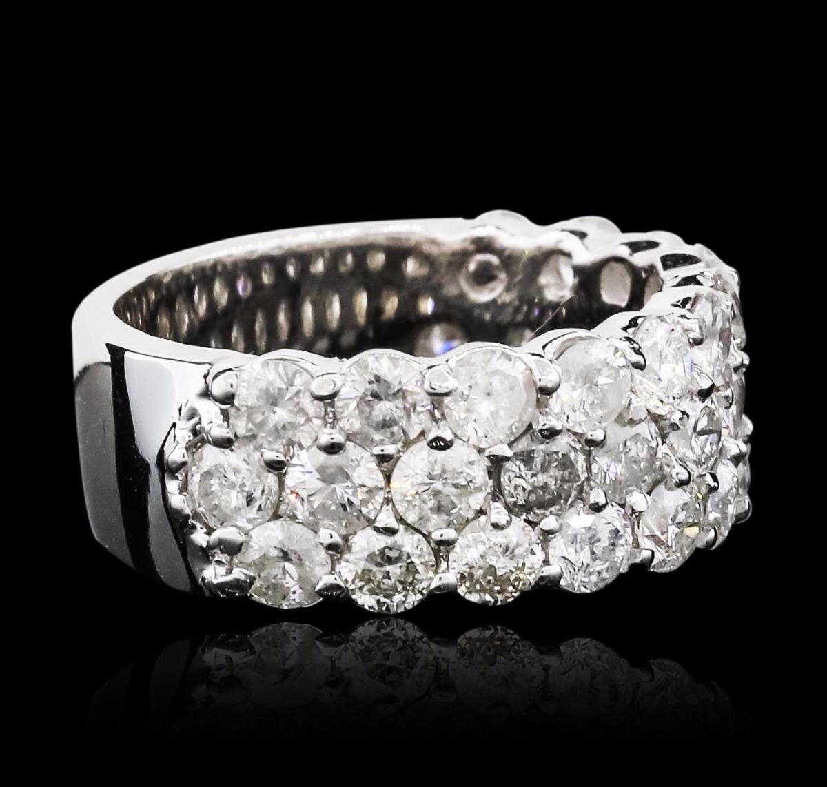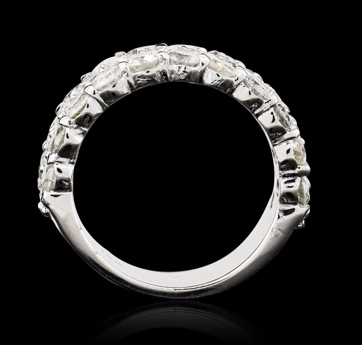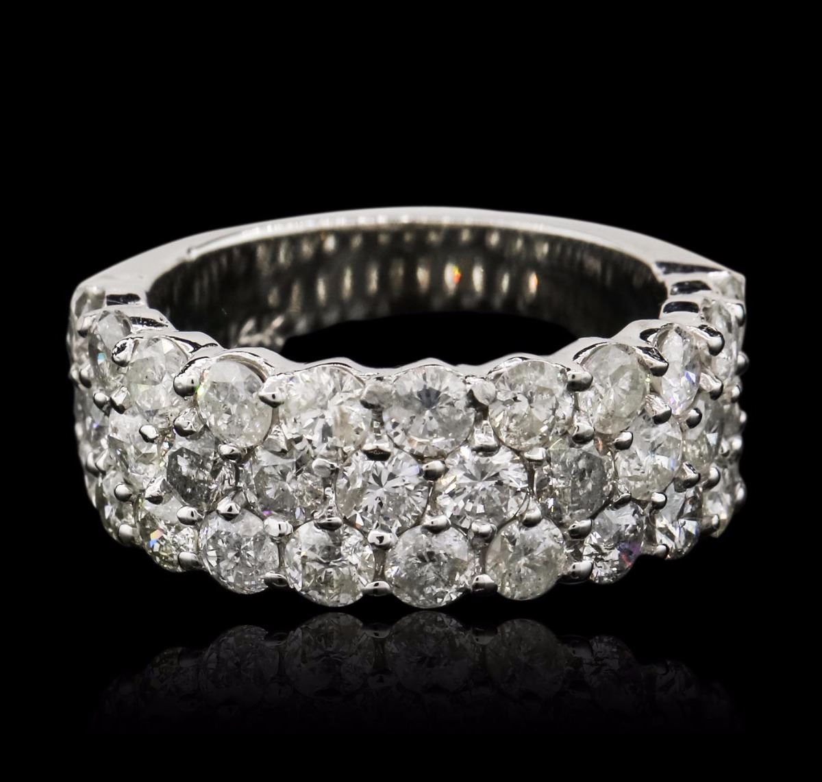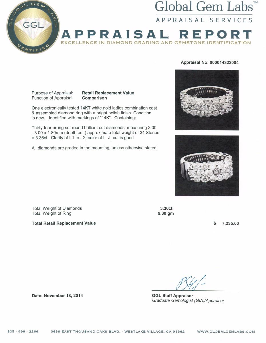 One electronically tested 14KT white gold ladies combination cast & assembled diamond ring with a bright polish finish. Identified with markings of "14K". Condition is new. Containing: Thirty-Four prong set round brilliant cut diamonds, measuring 3.00 - 3.00 x 1.80mm (depth est.) approximate total weight of 34 Stones = 3.36ct. Clarity: I-1 to I-2. Color: I - J, Cut is Good. All diamonds are graded in the mounting, unless otherwise stated. Total Weight of Diamonds 3.36ct. Total Weight of Ring 9.30 grams. GGL Appraised at $7,235.00.